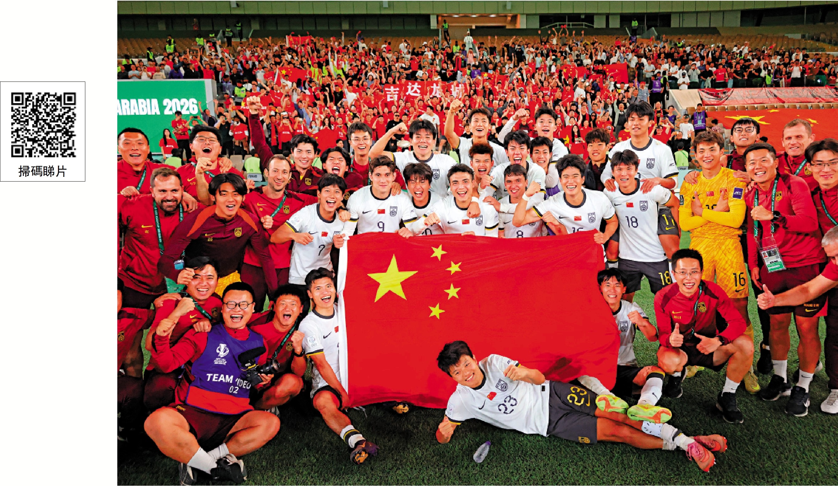 圖﹕U23國足在晉級決賽後,與球迷分享喜悅。\新華社