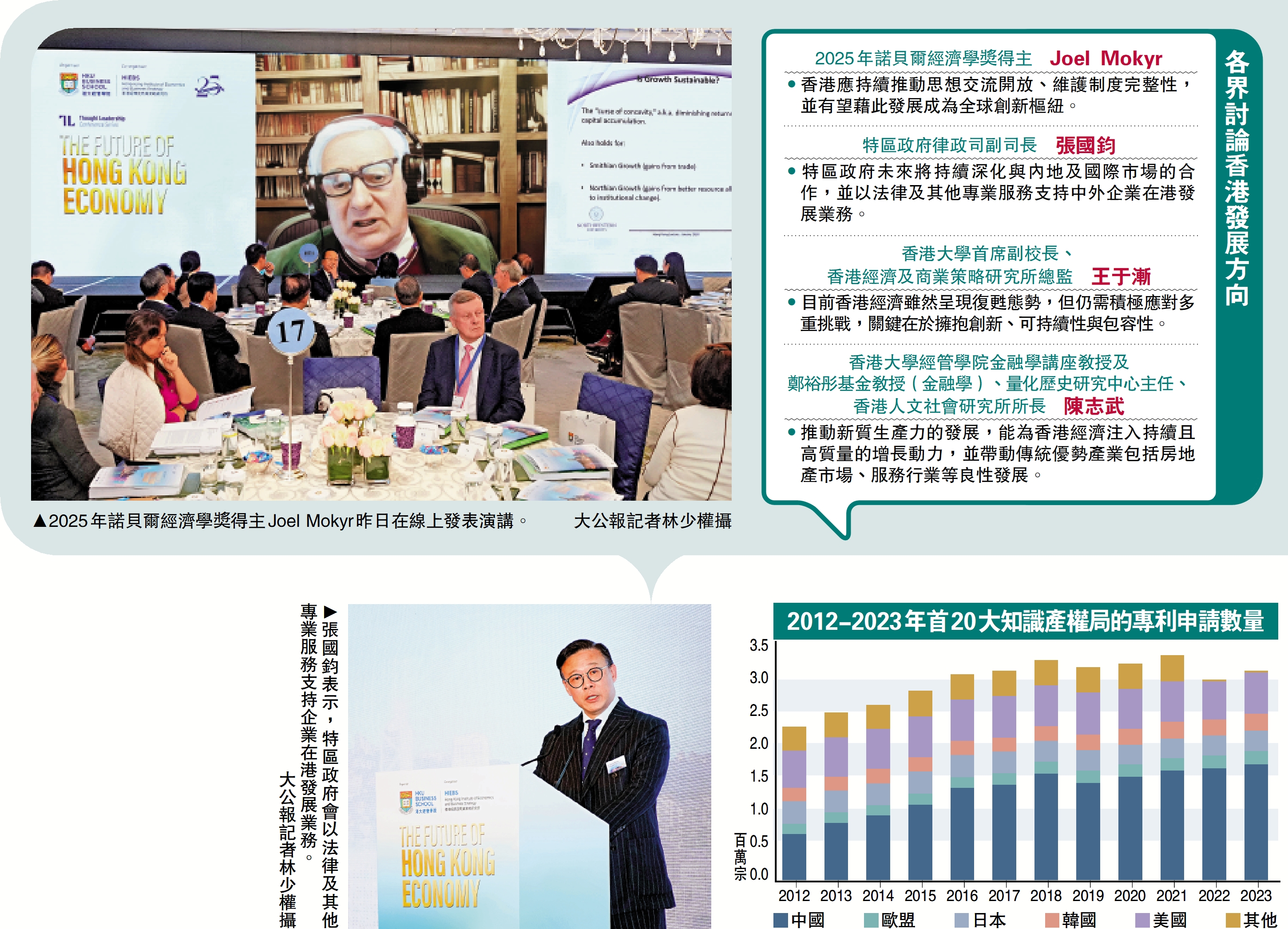 地緣政治不明朗因素持續增加,全球經濟與貿易正經歷結構重塑。2025年諾貝爾經濟學獎得主Joel Mokyr表示,全球已形成中國、美國、歐盟,以及其他國家的四大創新力量競爭格局。其中,中國在創新領域的進步尤為突出,體現在知識產權體系不斷完善、高校科研實力躍升等方面。早前公布的《2025年全球創新指數》百強創新集群中,「深圳─香港─廣州」排名全球第一,不過他強調,創新集群的成功具有脆弱性,香港應持續推動交流開放、維護制度完整性,並有望藉此發展成為全球創新樞紐。\大公報記者 李樂兒