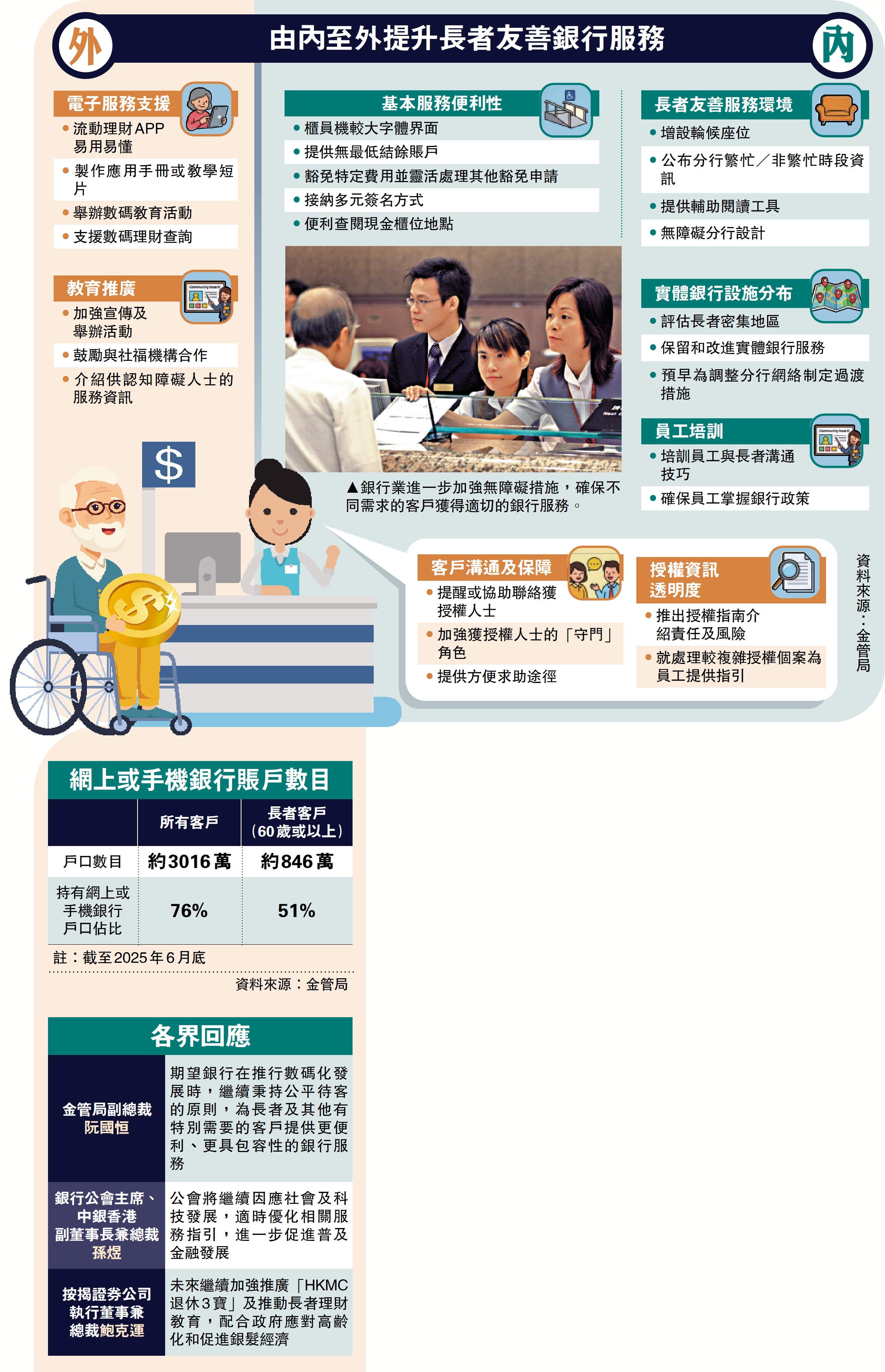 因應本港人口持續老齡化,金管局與銀行公會昨日宣布推出《長者友善銀行服務指引》。該指引涵蓋手機銀行及實體分行等範疇,訂立八項主要原則及53項具體建議措施,以提升對長者的服務支援。