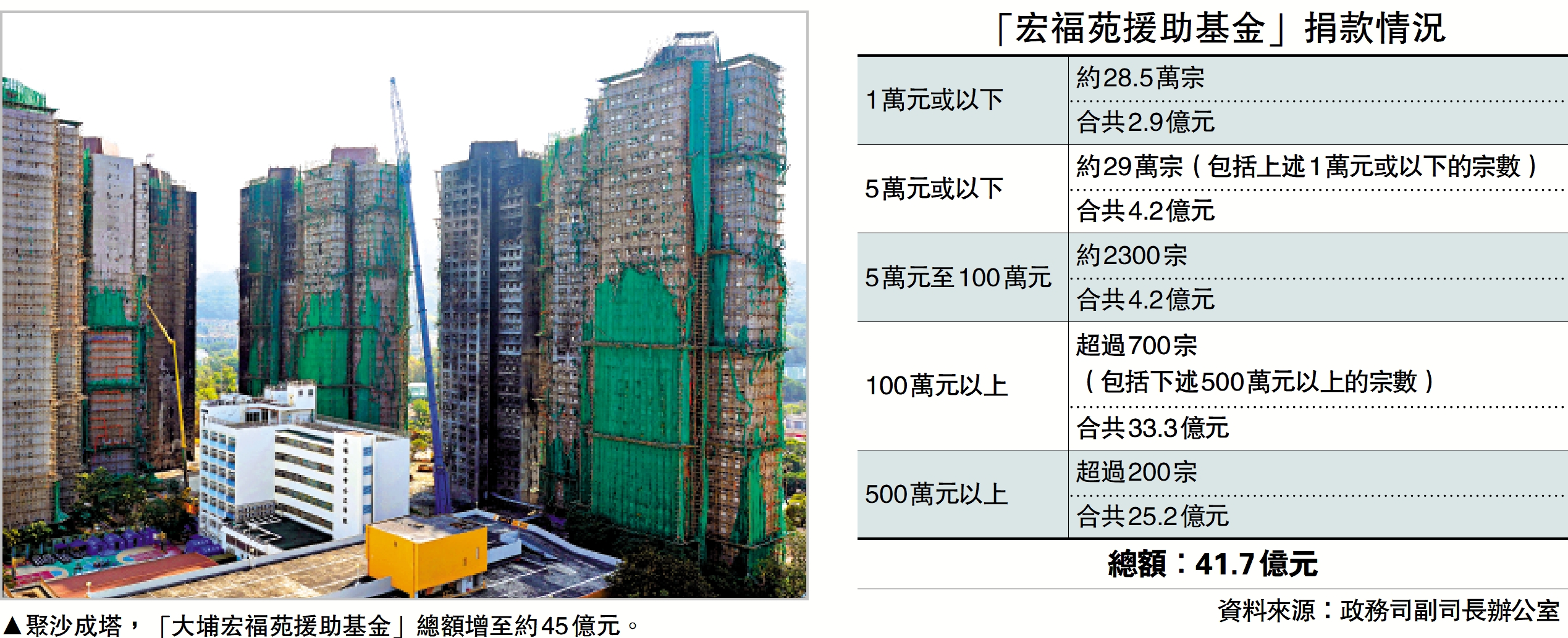 政務司副司長辦公室數據顯示,5萬元至100萬元的捐款約2300宗,有約4.2億元。100萬元以上的捐款有超過700宗,當中500萬元以上的巨額捐贈有逾200宗,共涉25.2億元。從數十萬筆小額捐款的默默匯入,到企業機構的大手筆支持,宏福苑的救援與重建過程,處處可見社會的溫情底色。