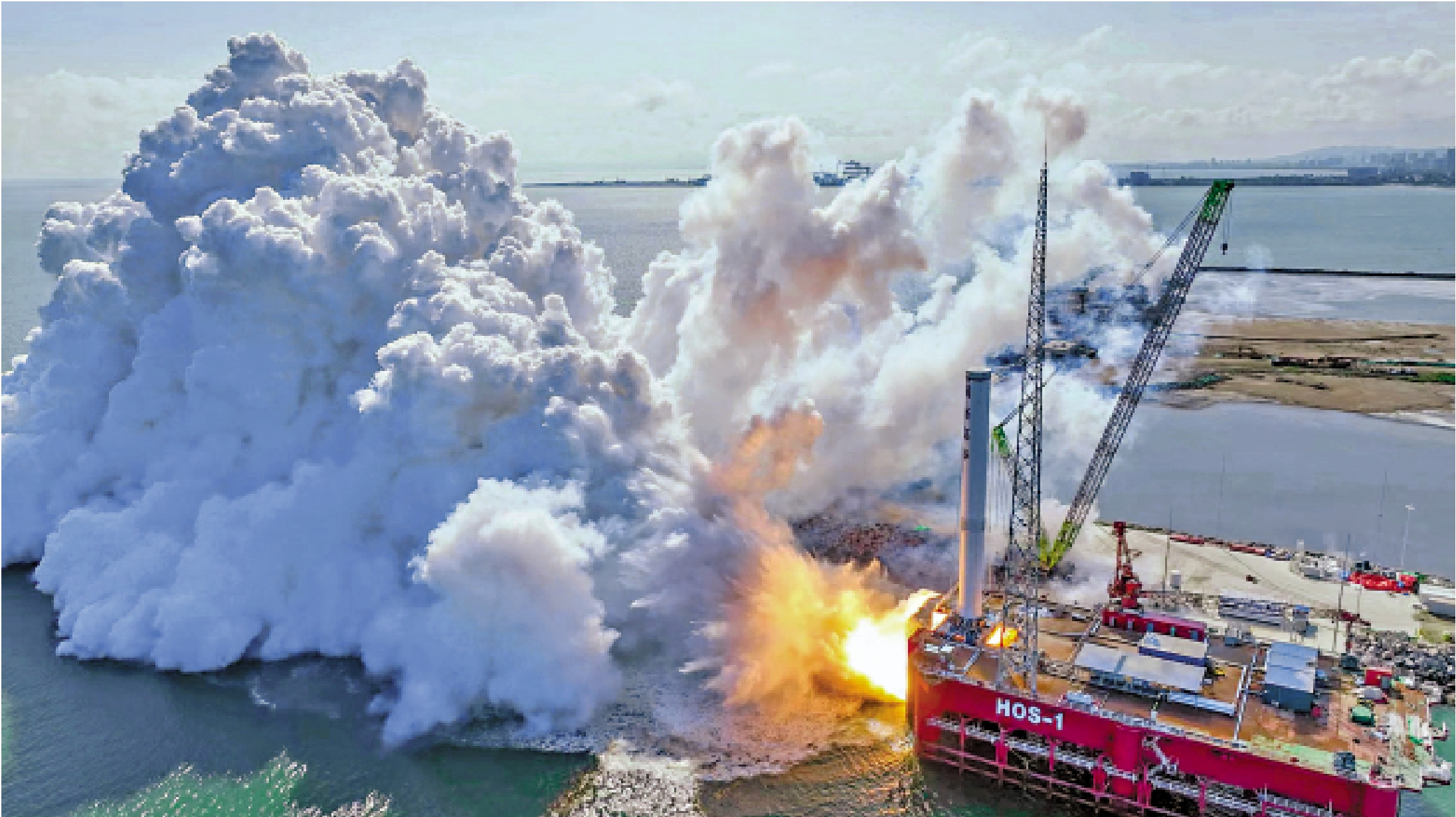 圖山東海陽東方航天港是中國目前唯一的商業航天海上發射母港。圖為2025年9月15日,天龍三號液體運載火箭在東方航天港海上平台進行一級動力系統試車。\新華社
