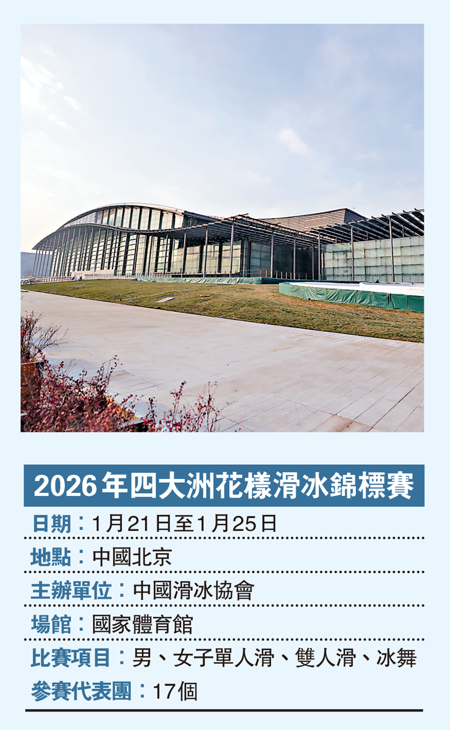 國家體育館別名「冰之帆」,位於北京市朝陽區天辰東路9號,是奧林匹克中心區的標誌性建築之一;2008年北京奧運會三大主場館之一;2022年冬奧會賽事場館之一。