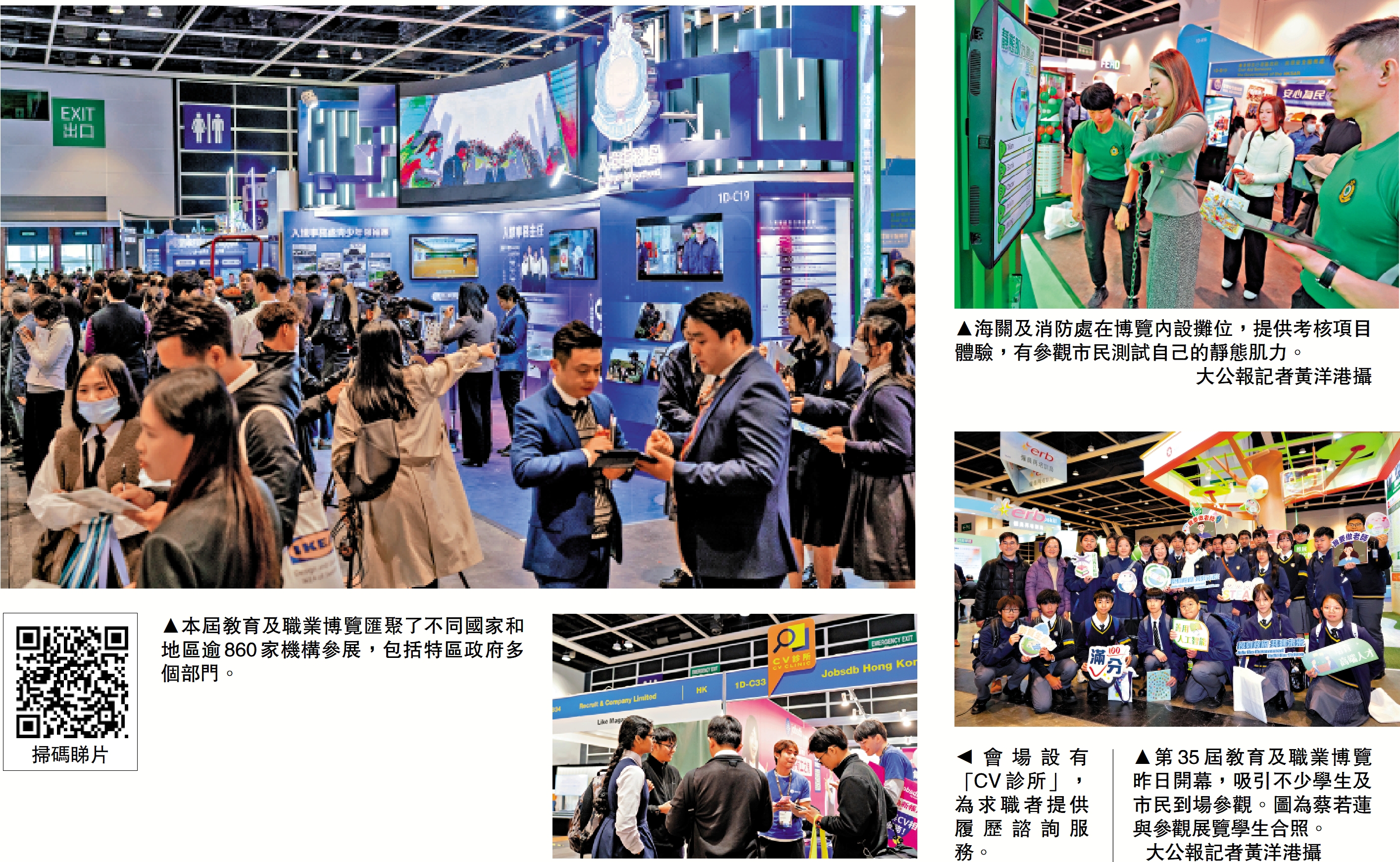 香港全力打造國際教育樞紐,力爭優質人才在港發展就業。由香港貿易發展局主辦的第35屆教育及職業博覽昨日開幕,一連四天(22日至25日)於香港會議展覽中心舉行,幫助青年掌握未來發展趨勢,實現夢想。今年博覽匯聚來自23個國家及地區、超過860家機構參展,包括31個政府決策局、部門,以及多間專上院校、升學中心等,旨在吸引鄰近地區學生來港升學及海外學生留港就業,部分僱主更設即場面試。