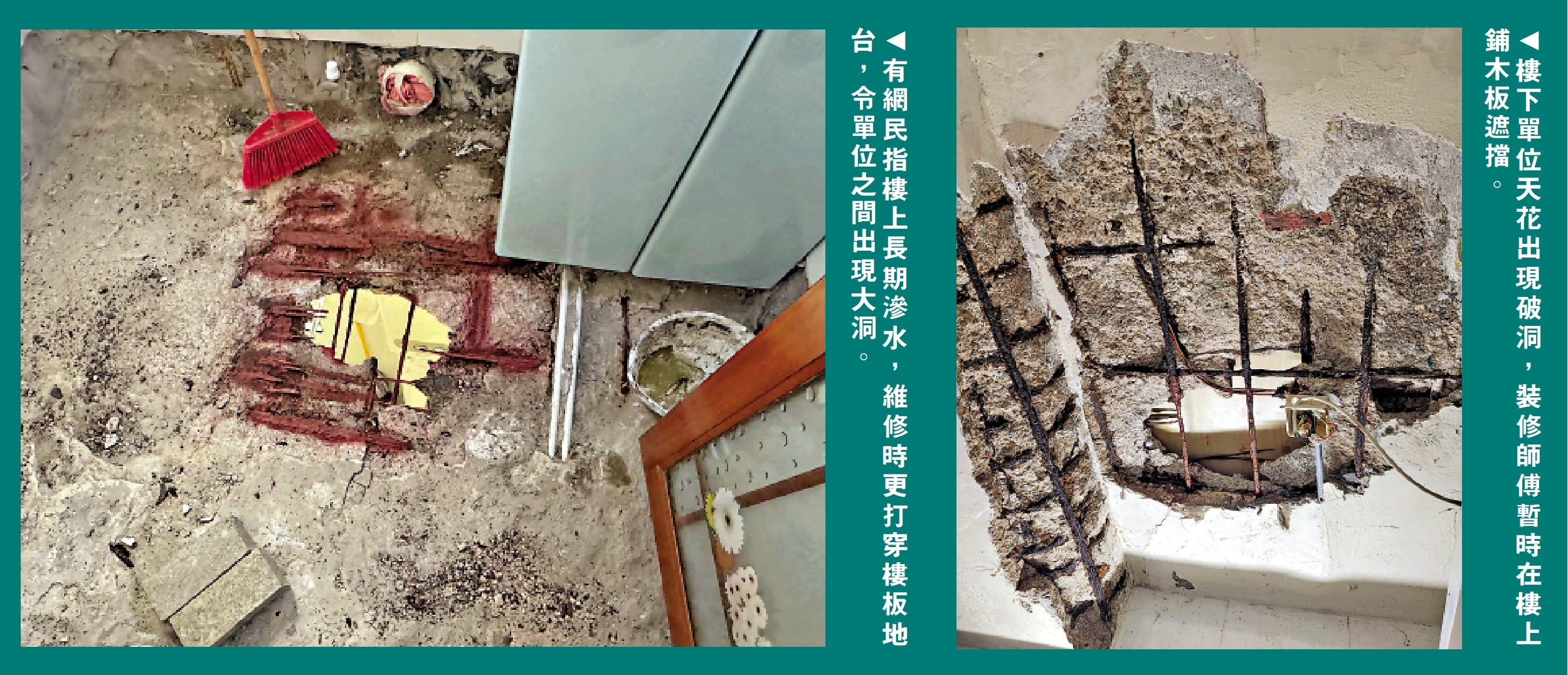 從事主上載相片可見,石屎跌落後露出鋼筋,部分鋼筋已斷裂,樓上樓下甚至可通過被鑿穿位置對望。事主稱,樓上工程負責人指「我哋識處理、樓上嘅事唔需要同樓下交代、樓下無權去監督樓上點做」。事主稱見到樓板石屎變鬆、鋼筋發霉,不同意工程人員打算到樓下單位「放塊木板,再在樓上倒石屎填番個窿就當解決」,但樓上業主和裝修老闆責怪事主阻礙工程進度。