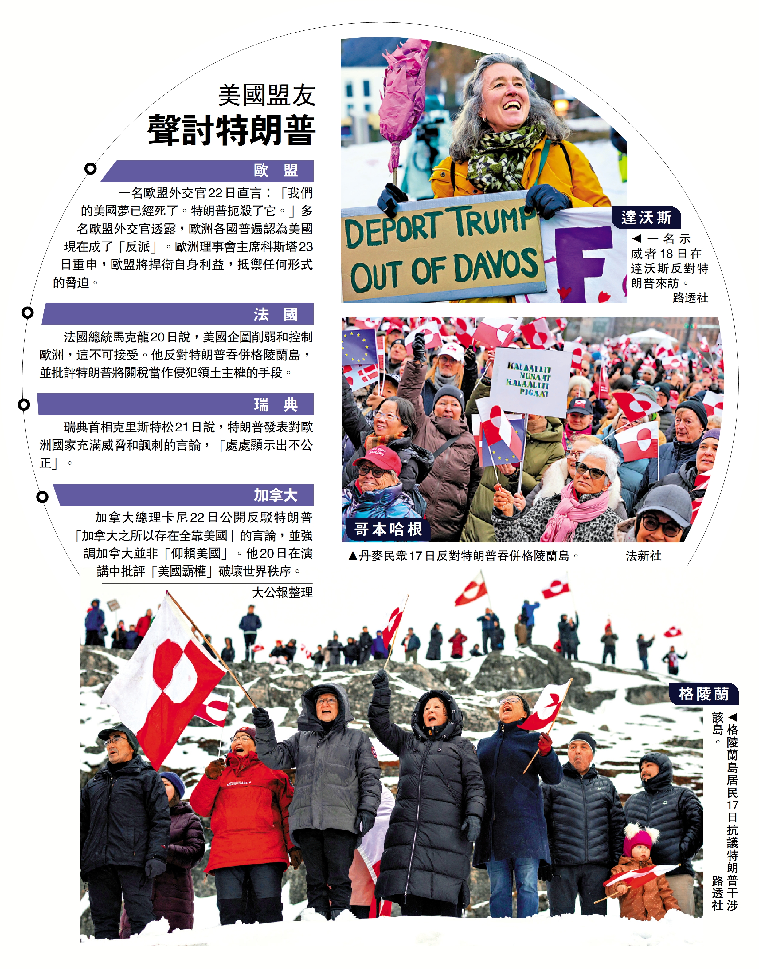一名歐盟外交官22日直言:「我們的美國夢已經死了。特朗普扼殺了它。」多名歐盟外交官透露,歐洲各國普遍認為美國現在成了「反派」。歐洲理事會主席科斯塔23日重申,歐盟將捍衛自身利益,抵禦任何形式的脅迫。