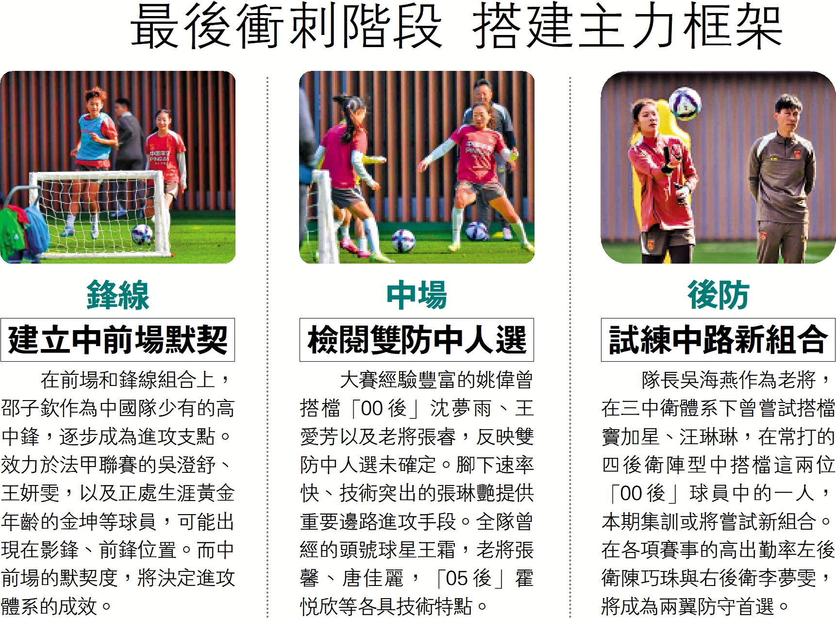 在前場和鋒線組合上,邵子欽作為中國隊少有的高中鋒,逐步成為進攻支點。效力於法甲聯賽的吳澄舒、王妍雯,以及正處生涯黃金年齡的金坤等球員,可能出現在影鋒、前鋒位置。而中前場的默契度,將決定進攻體系的成效。