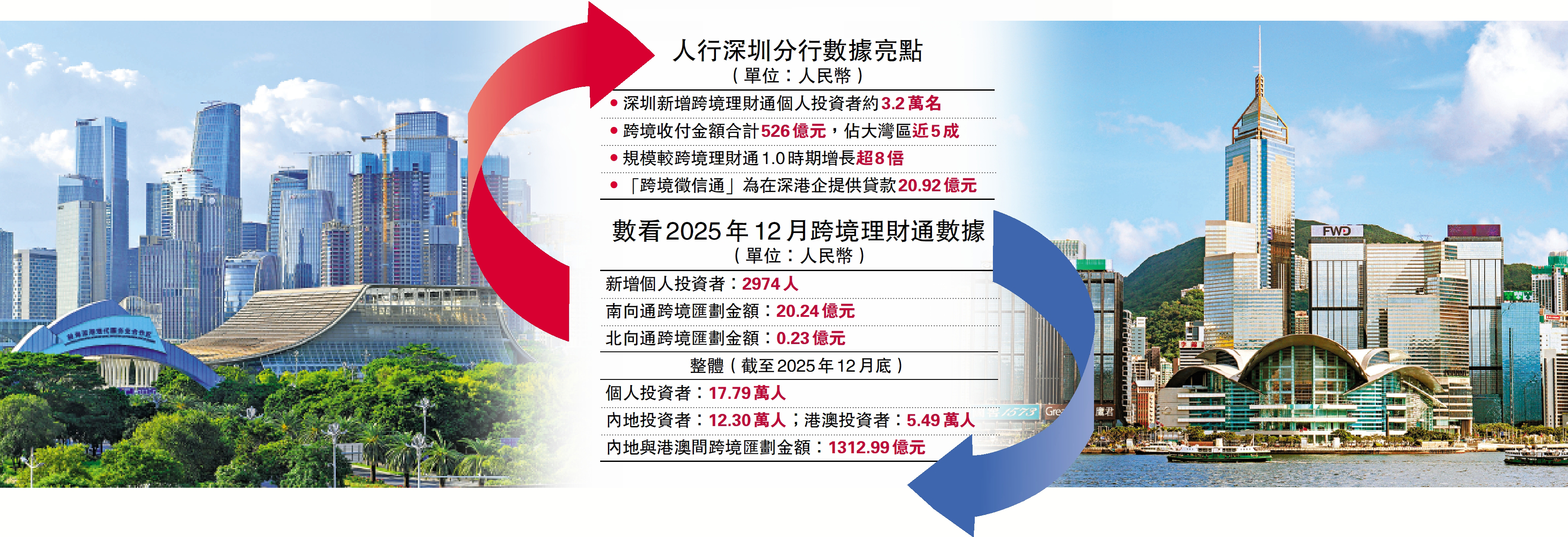 中國人民銀行深圳分行、國家外匯管理局深圳市分局昨日舉行2025年深圳金融運行情況新聞發布會。人行深圳分行外匯綜合處一級調研員段文海表示,自「跨境理財通」2.0版本實施以來,深圳銀行新增個人投資者約3.2萬名,跨境收付金額合計526億元(人民幣,下同),金額佔大灣區比重近五成,業務規模較1.0時期增長超8倍,持續滿足大灣區居民跨境理財需求。\大公報記者 毛麗娟