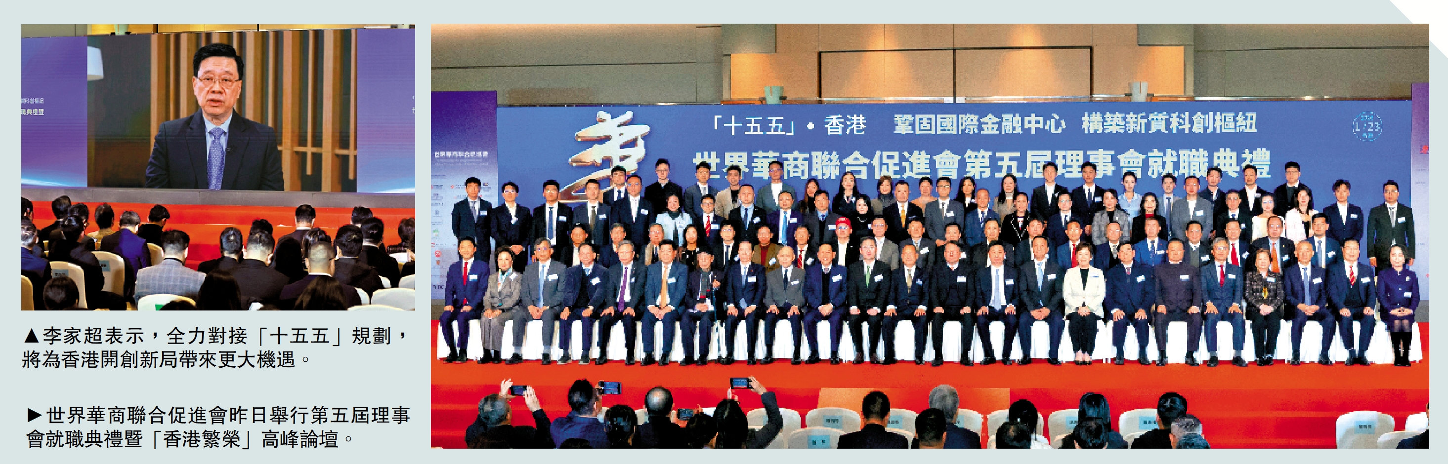 世界華商聯合促進會昨(23日)舉行第五屆理事會就職典禮暨「香港繁榮」高峰論壇,論壇聚焦國家「十五五」規劃與香港發展定位,現場由經濟界名人及有關領域的院士專家及逾400位與會者作深入交流。行政長官李家超在典禮上以視像致辭,他形容:「同心山成玉,協力土變金。」香港上下必定積極有為,主動對接國家「十五五」規劃,扎實推動經濟高質量發展,深度參與粵港澳大灣區建設。他表示,特區政府會從深化國際合作、推進灣區融合、鞏固制度優勢、聚焦創科驅動及匯聚高端人才等五方面,全力推動發展工作。\大公文匯全媒體記者 曾業俊(文)、北山彥(圖)