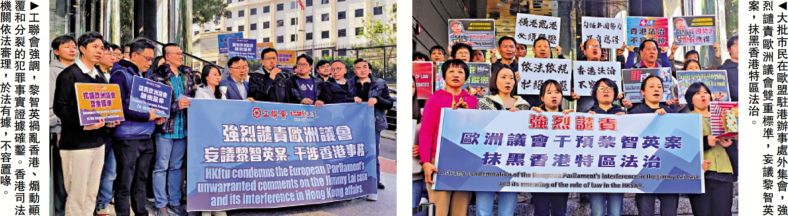 【大公報訊】記者龔學鳴報道:美國及歐洲議會近日對香港法庭依法審理黎智英案指手畫腳,歐洲議會更通過所謂「涉黎智英案決議」,詆毀及抹黑香港司法制度,干預香港事務。工聯會及多批市民昨日到歐盟駐港辦事處外集會,強烈譴責歐洲議會雙重標準,妄議黎智英案,企圖干涉香港事務,抹黑香港特區法治。