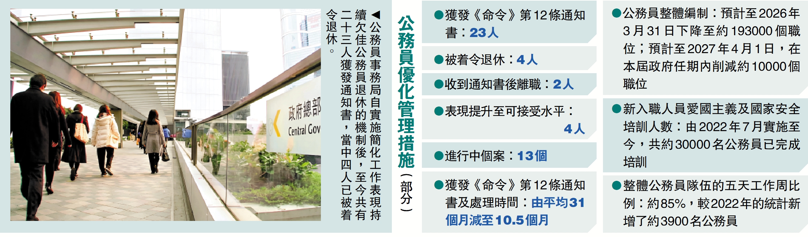 公務員事務局提交予立法會的文件顯示,截至本月中,共23人觸發機制,當中4人已被着令退休,而簡化後個案平均處理時間亦大幅縮減三分之二,由31個月減至10.5個月。此外,當局亦正研究優化工作表現評核機制,以配合去年施政報告提出成立的「部門首長責任制」。\大公報記者 龔學鳴、李清