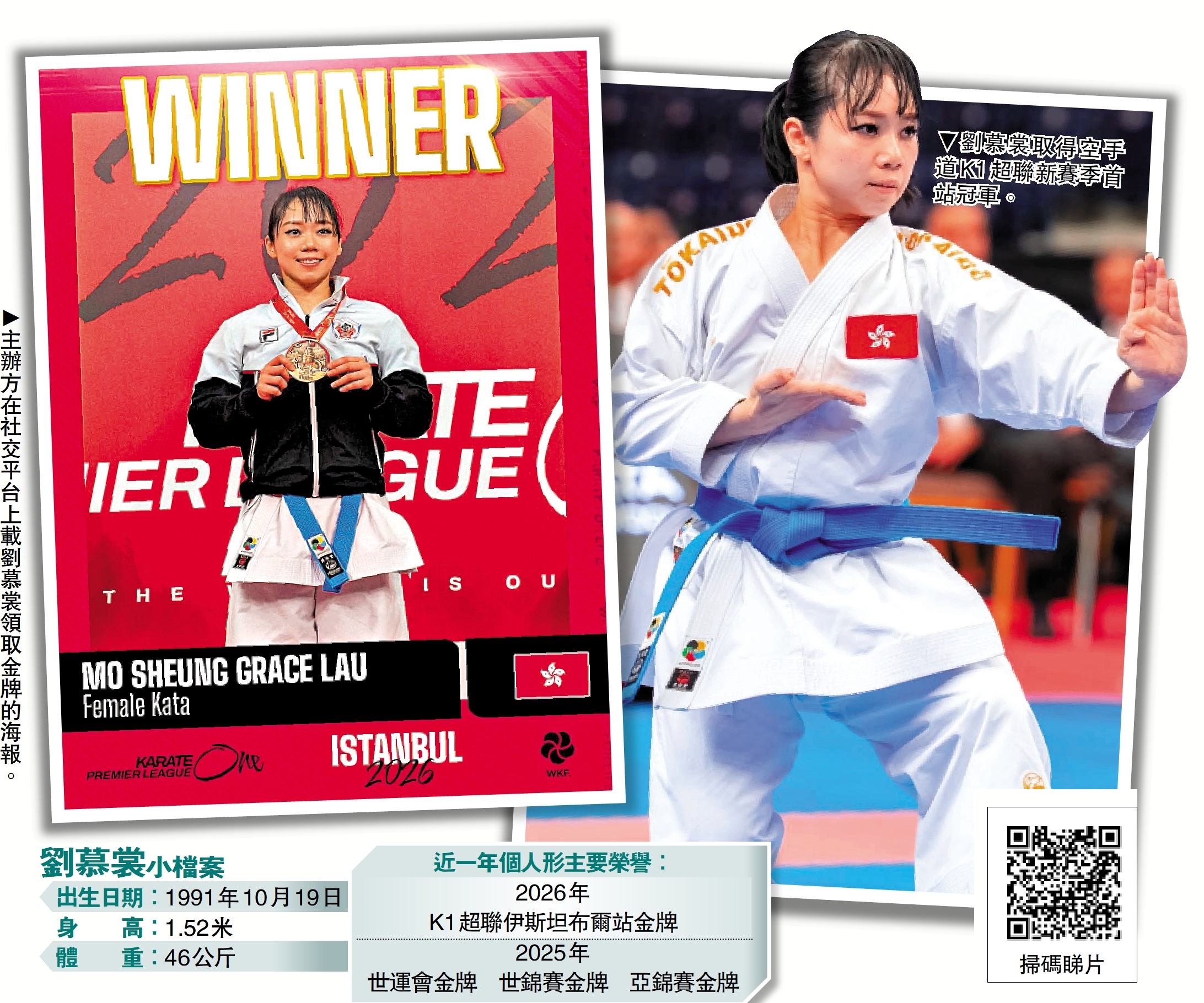 空手道K1超級聯賽2026新賽季25日在土耳其伊斯坦布爾結束首站賽事,中國香港空手道女子個人形運動員、「世一」劉慕裳在決賽再對陣日本名將、世界排名第二的尾野真步。劉慕裳在全新賽制下憑一套「北谷屋良公相君」獲得裁判全員投票認可,最終以7:0輕鬆取勝,不但延續自己在國際賽達成的6連冠佳績,更打響K1超聯新賽季衛冕頭炮。\大公報記者 朱家立