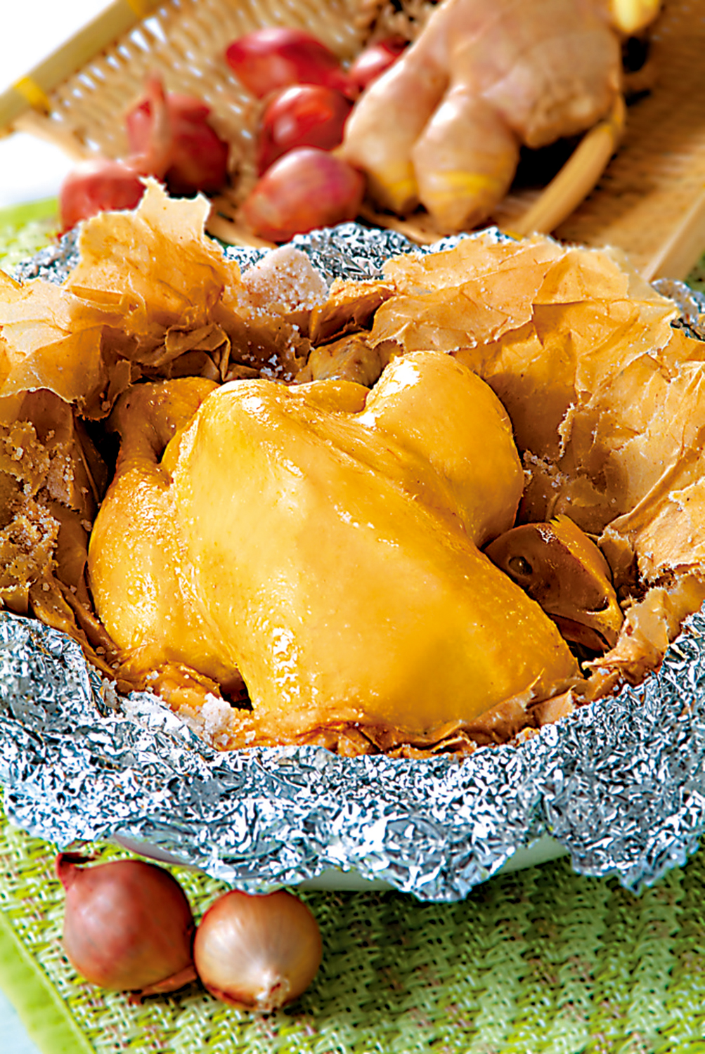 材料:光雞一隻、粗鹽一千二百克、桌鹽一茶匙,五香粉一茶匙、新鮮沙薑三十克、生油一湯匙、烘焙專用紙(亦稱牛油紙)一張、棉繩一根、鋁紙(Aluminum Foil俗稱錫紙)一張長約六十厘米寬度四十五點七厘米的才夠包着整隻雞。