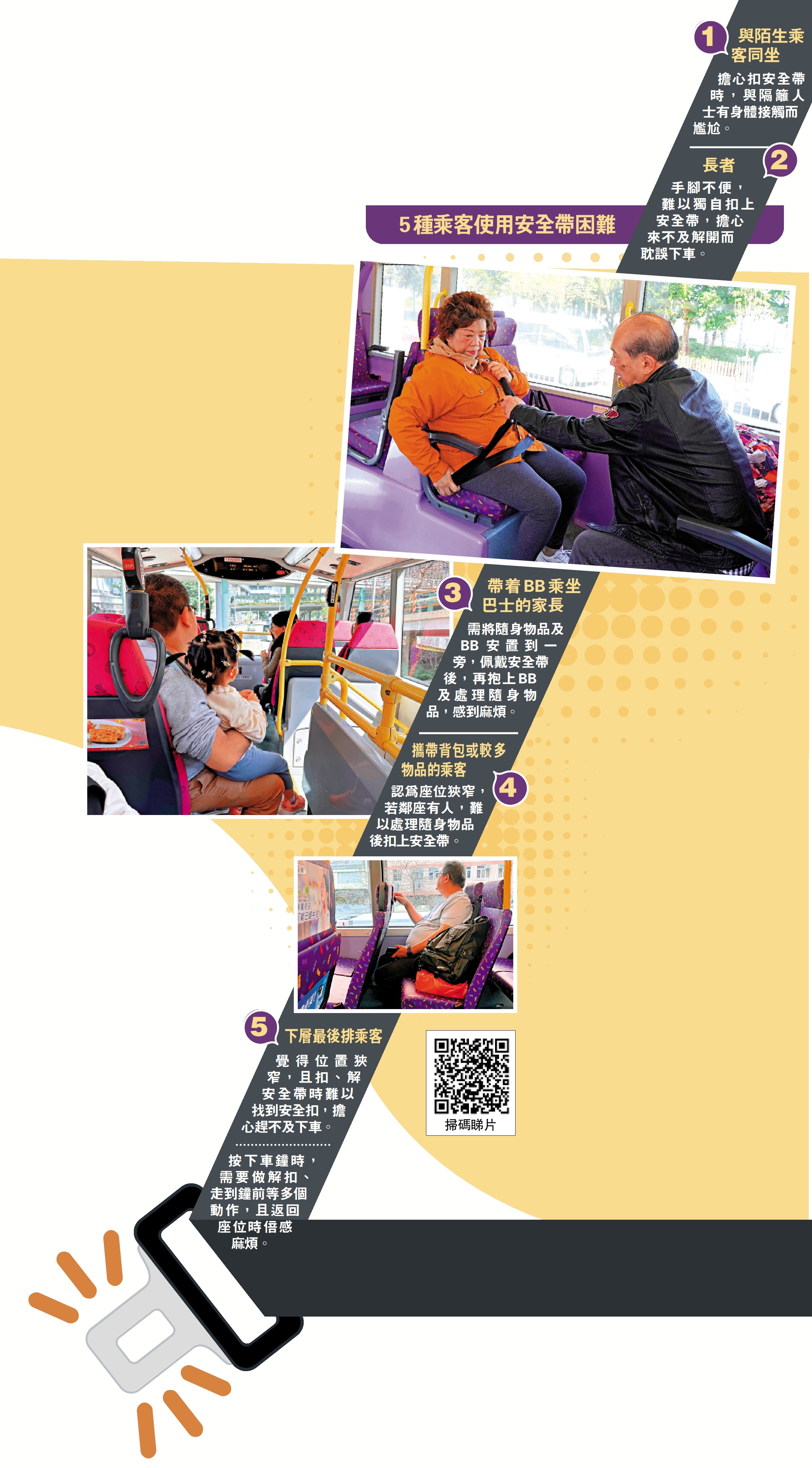 此外,記者實測城巴,乘坐下層最後一排有安全帶的座位時,發現空間狹窄,若鄰座有其他乘客,不易找到安全帶扣,較為困難進行扣上及解開安全帶;且該座位附近並未設有下車鐘,若需按鐘則要解開安全帶,狹窄的位置加上顛簸的車廂令人狼狽。
