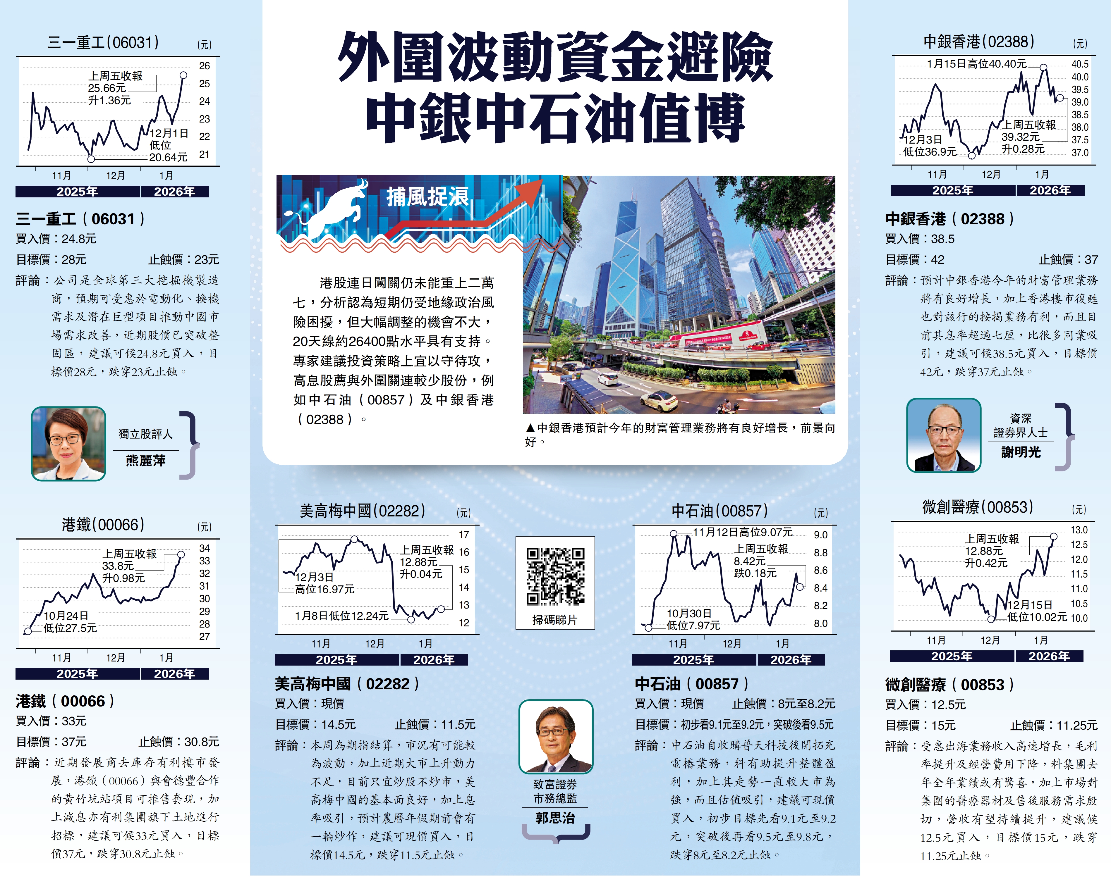 港股連日闖關仍未能重上二萬七,分析認為短期仍受地緣政治風險困擾,但大幅調整的機會不大,20天線約26400點水平具有支持。專家建議投資策略上宜以守待攻,高息股薦與外圍關連較少股份,例如中石油(00857)及中銀香港(02388)。