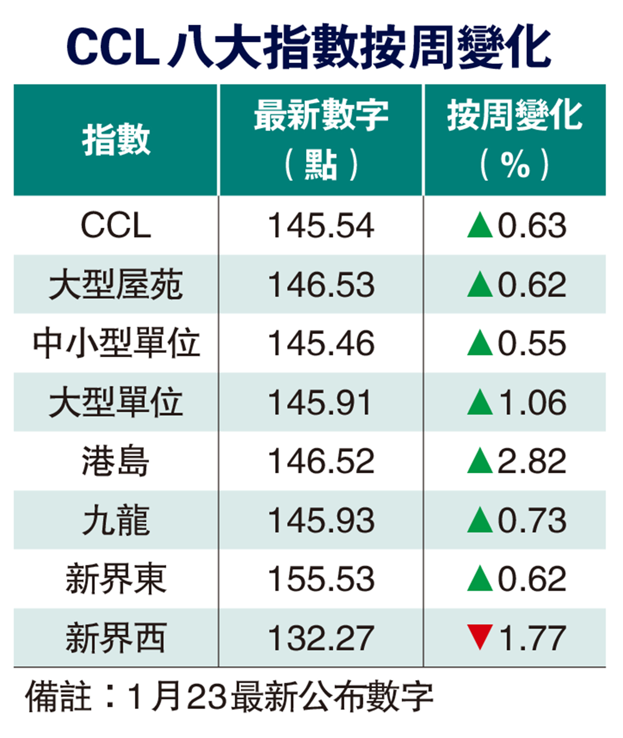 中原地產研究部高級聯席董事楊明儀指出,CCL今年暫升0.99%,由於近日新盤銷售理想,銀行亦積極推出按揭優惠,樓市氣氛活躍,二手筍盤快速被消耗,買家開始追價入市,料新春旺市可能提早出現,CCL有望於新春前突破147點水平。