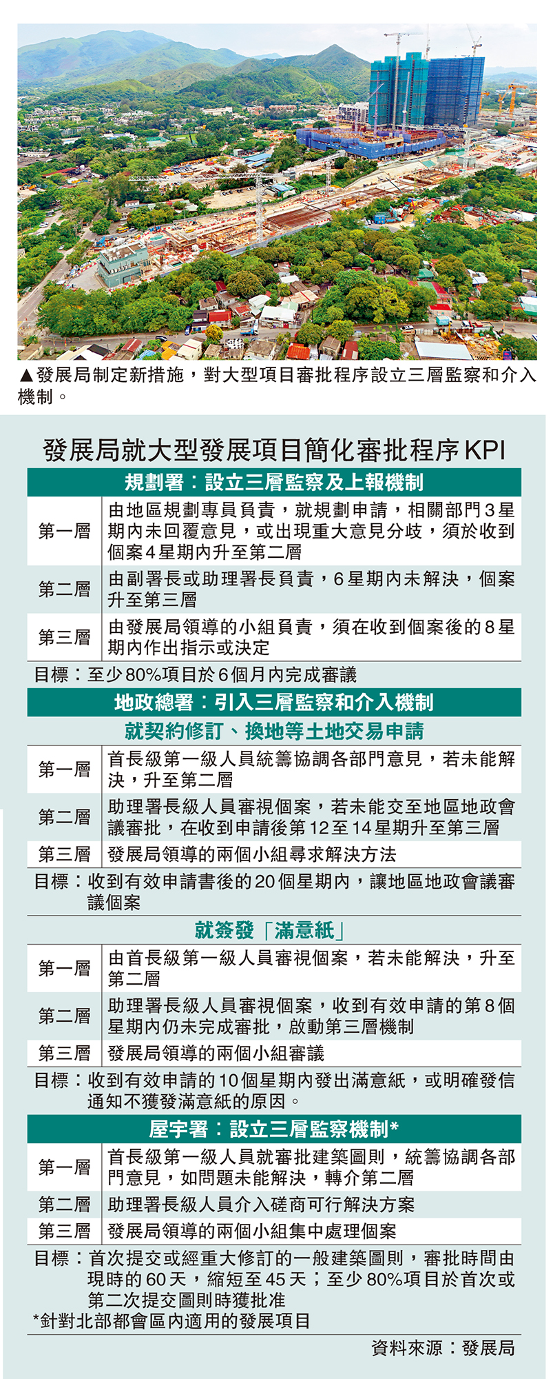 新措施下,若大型發展項目涉及運輸署、消防處、環境保護署、路政署等其他部門的審批,發展局會要求部門在期限內提供意見、解決分歧和請示高層介入,並聯同不同部門緊密合作。就未能解決的個案,須上呈至發展局領導的兩個小組,與北都相關的申請,上呈至發展局常任秘書長(規劃及地政)主持的北部都會區專案監督辦公室;北都以外的項目,上呈至由發展局副局長主持的精簡發展管制督導小組。