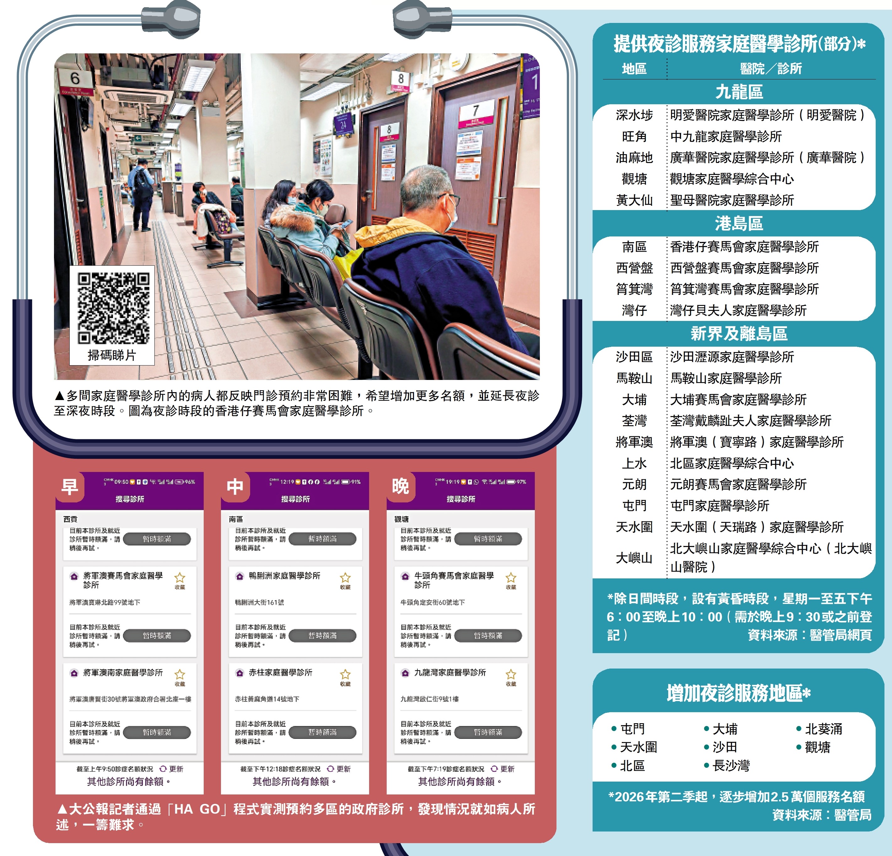 現時醫管局的家庭醫學門診,每年提供超過500萬人次門診服務,提供服務範圍包括抽血、定期覆診、預約門診等,全港75間家庭醫學診所,只有23間有提供夜間門診服務至晚上10時。大公報記者近日走訪港九新界多區的家庭醫學診所,了解夜間門診情況,以及探討市民預約求診是否困難?作為服務使用者,在夜診服務實際操作上又有哪些地方需要優化?