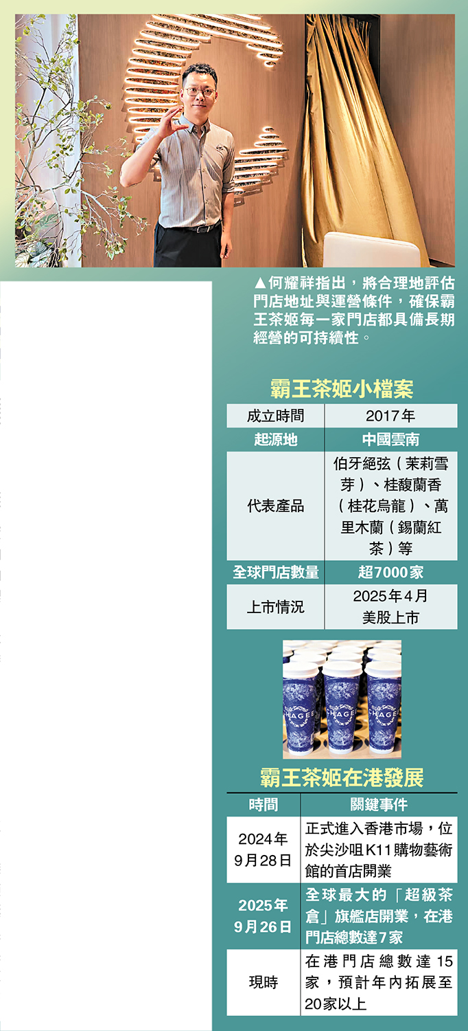 目前霸王茶姬在香港已有15家門店,全部由集團直營,並預計今年內拓展至20家以上。何耀祥指出,門店選址方面,將科學、合理地評估門店地址與運營條件,確保每一家門店都具備長期經營的可持續性。他強調,開店關注的不只是租金水平,更包括區域人流結構、消費習慣以及門店服務,希望向香港消費者提供長期、穩定的茶飲服務。