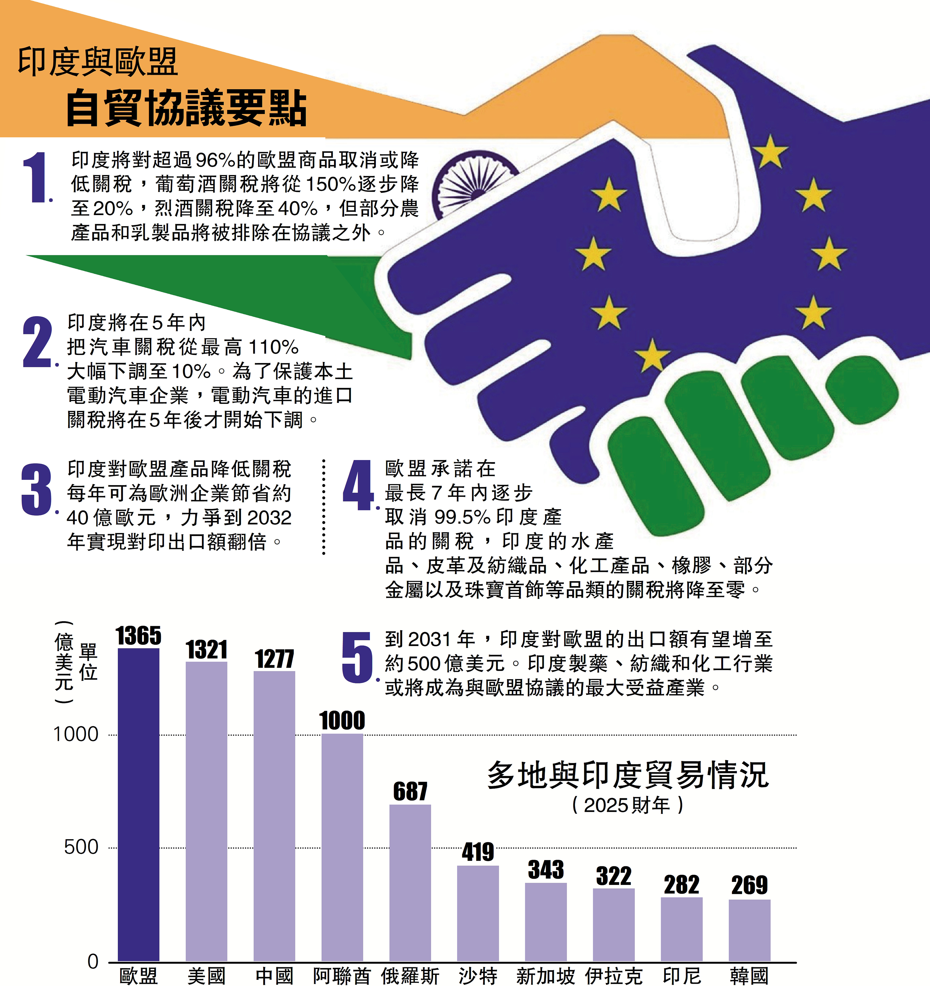 1.印度將對超過96%的歐盟商品取消或降低關稅,葡萄酒關稅將從150%逐步降至20%,烈酒關稅降至40%,但部分農產品和乳製品將被排除在協議之外。