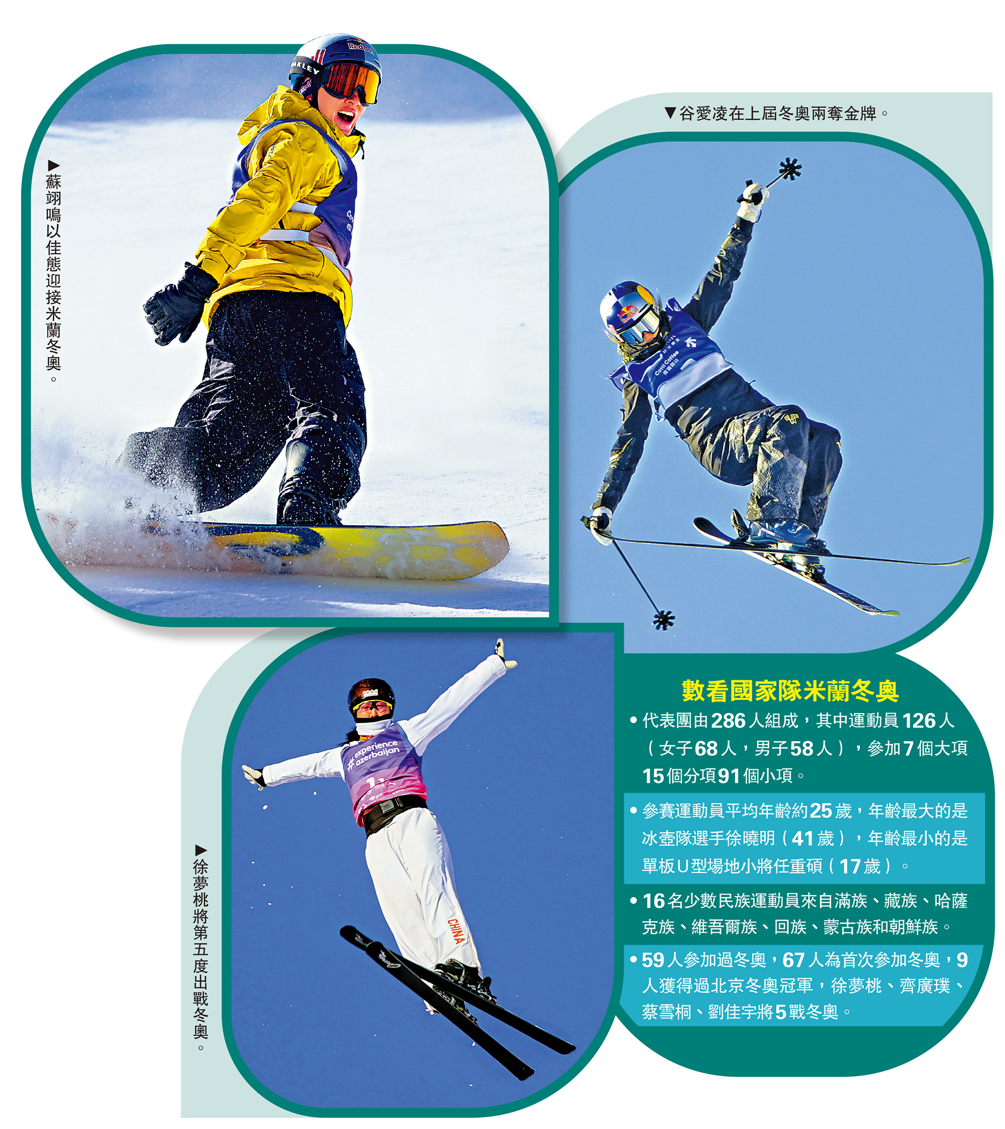 •參賽運動員平均年齡約25歲,年齡最大的是冰壺隊選手徐曉明(41歲),年齡最小的是單板U型場地小將任重碩(17歲)。