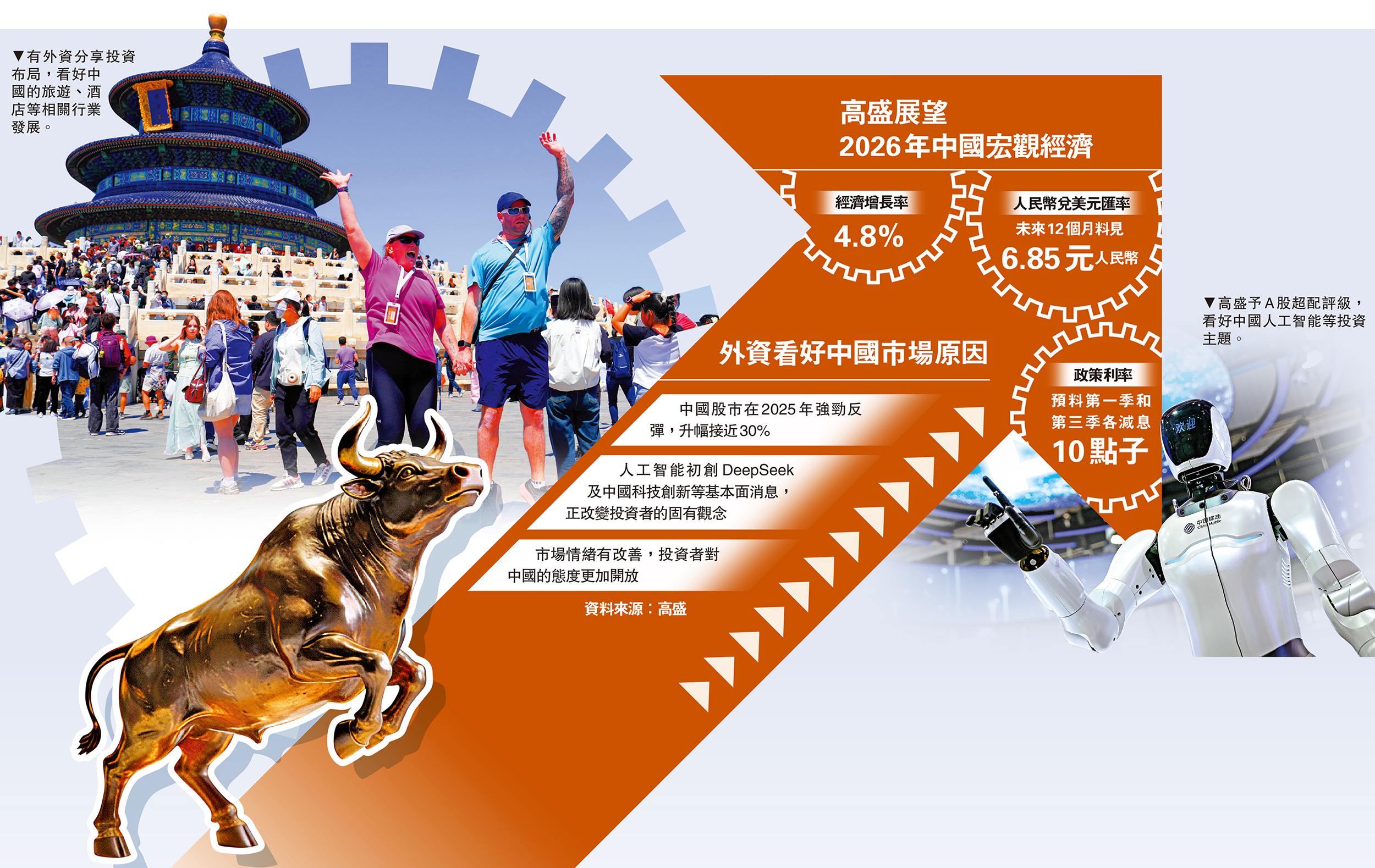宏觀經濟方面,高盛料中國2026年經濟增長約4.8%,較市場預測(4.5%)相對樂觀。高盛亞太首席經濟學家迪安竹(Andrew Tilton)表示,儘管受美國關稅措施影響,中國在2025年的出口表現理想,預期今年將繼續保持增長,而內需仍然相對疲弱,主要是預期內地房地產行業仍然遇到下行壓力。另外,高盛預期人民幣匯價大致溫和升值,在未來3、6、12個月,將分別見6.95元、6.9元和6.85兌1美元。由於中國的通脹率在亞洲區之中相對溫和,相信仍可保持出口的競爭力。