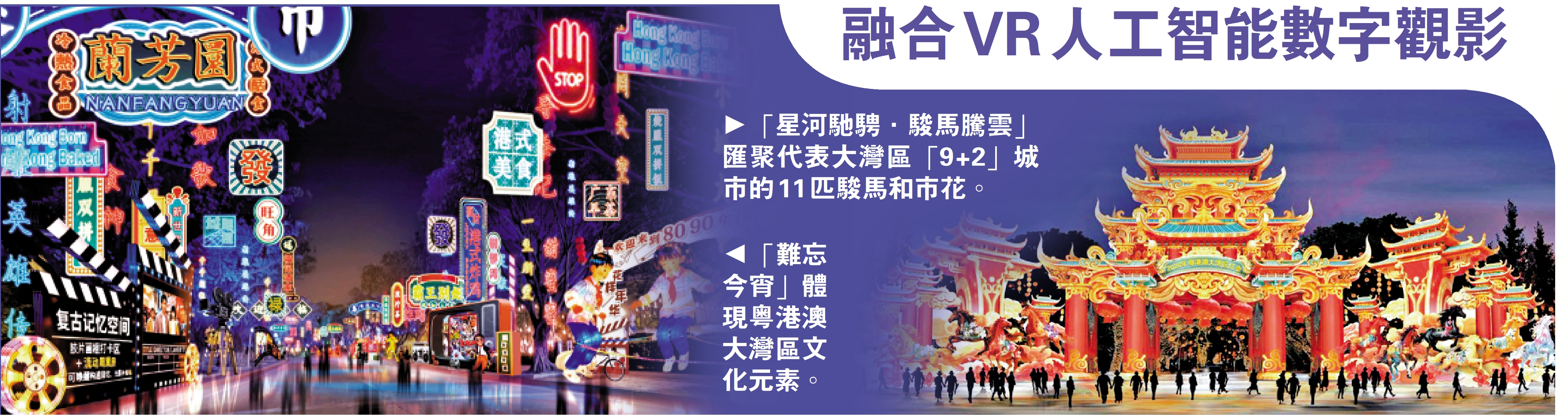 位於燈會主入口的「星河馳騁·駿馬騰雲」燈組,以代表大灣區「9+2」城市的11匹駿馬和市花為起點,傳遞對灣區「祥瑞常伴、蓬勃發展、文化共興」的美好期許。