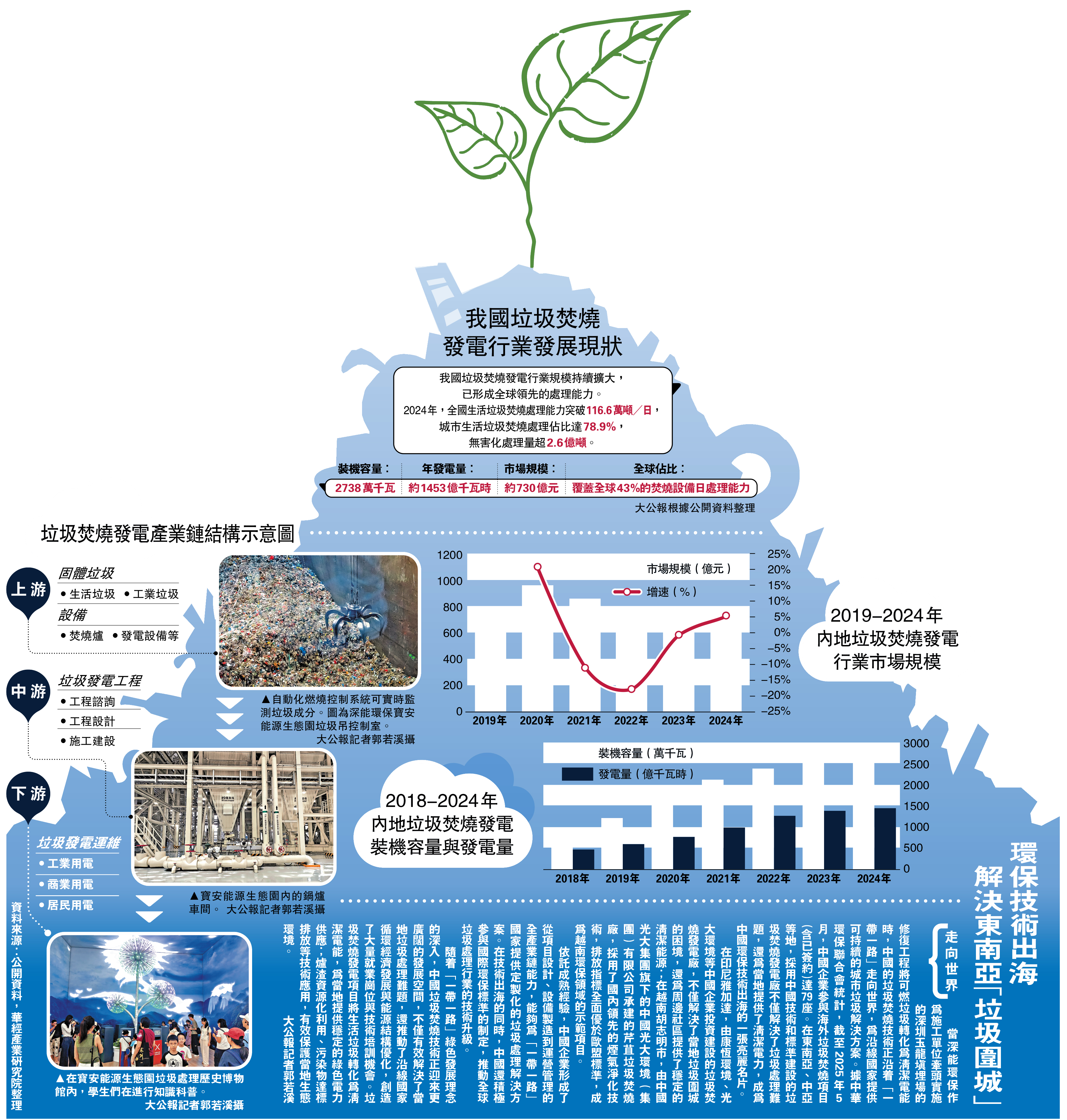 隨着「一帶一路」綠色發展理念的深入,中國垃圾焚燒技術正迎來更廣闊的發展空間,不僅有效解決了當地垃圾處理難題,還推動了沿線國家循環經濟發展與能源結構優化,創造了大量就業崗位與技術培訓機會。垃圾焚燒發電項目將生活垃圾轉化為清潔電能,為當地提供穩定的綠色電力供應;爐渣資源化利用、污染物達標排放等技術應用,有效保護當地生態環境。\大公報記者郭若溪