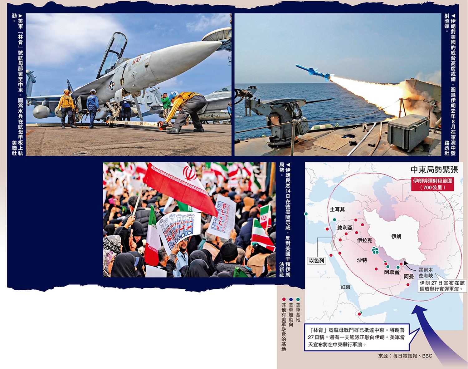 美國總統特朗普28日對伊朗發出新的威脅,聲稱「一支龐大的艦隊」正駛向伊朗,如果伊朗拒絕達成核協議,將面臨比去年6月美軍轟炸伊朗核設施「更猛烈」的打擊。美軍「林肯」號航母戰鬥群已抵達中東,美軍27日稱,將在該地區舉行大規模軍演。與此同時,伊朗宣布在霍爾木茲海峽舉行實彈軍演,雙方劍拔弩張。阿聯酋和沙特先後表示,不允許美軍利用其領土對伊朗發動襲擊。\