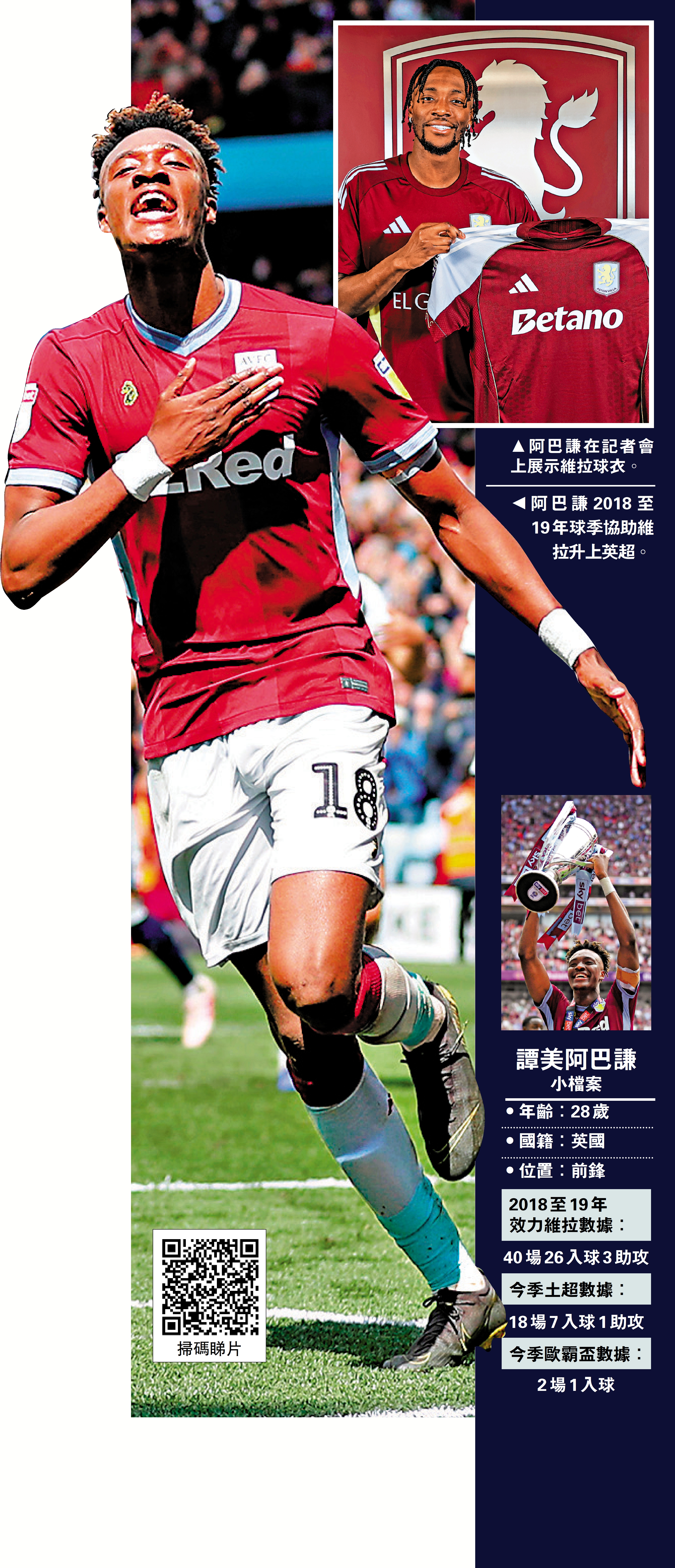 阿士東維拉自艾馬利執掌帥印後,已連續3季領軍出戰歐洲賽,今季更進一步成為英超爭標分子,為此維拉決定在冬季轉會窗大展拳腳,目標直指7年前升班功臣,28日宣布將以1800萬英鎊(約1.8億港元)購入英格蘭前鋒譚美阿巴謙。同時,球隊更準備簽另一舊將杜格拉斯雷斯,務求穩妥取得歐聯資格,同時衝擊歐霸盃冠軍,長遠目標提升球隊地位及商業價值,超過表現令人失望的熱刺成為新「Big 6」,吸引更多球星來投。\大公報記者 梁潤森