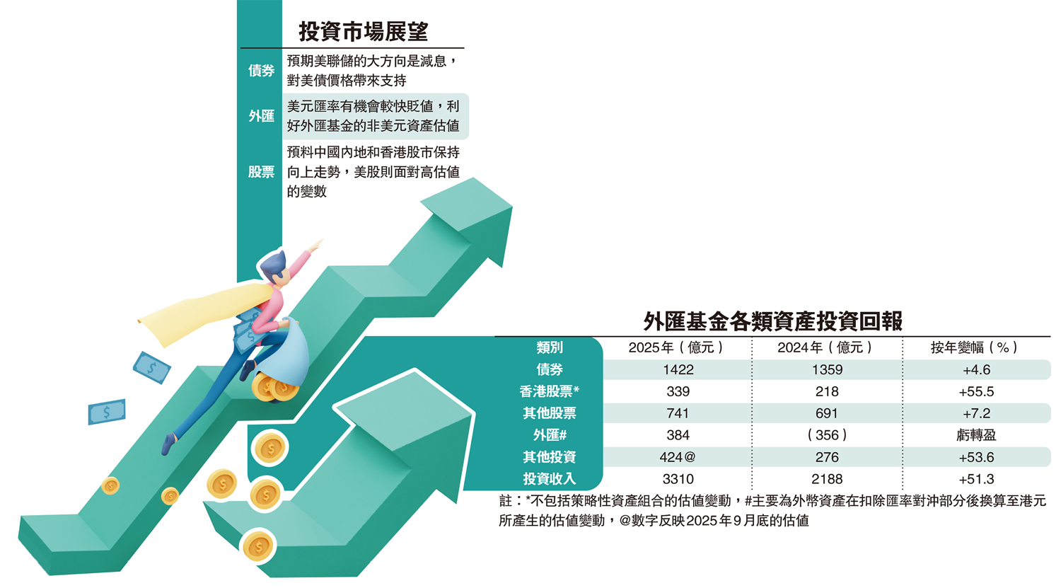 展望2026年投資前景,債務資本市場人士表示,債券(尤其美債)佔外匯基金的比重高達69%,而美聯儲明年的大方向是繼續減息,對債券價格帶來支持。市場現時大致預期美聯儲今年有機會減息2至3次,幅度50至75點子。