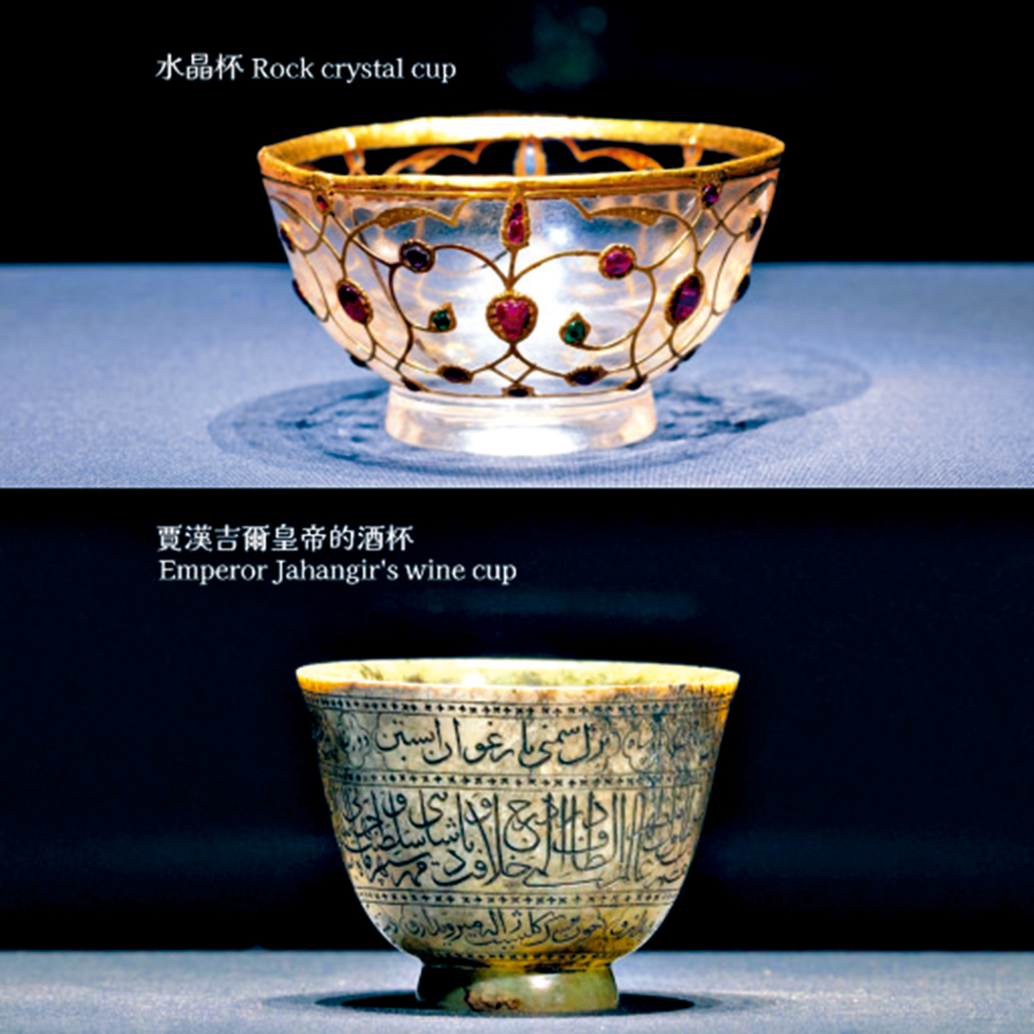 賈漢吉爾皇帝不僅以藝術品味著稱,更以嗜酒聞名。他在親撰的回憶錄中,坦言自己對酒的熱愛與飲酒習慣。展覽現場兩件與他密切相關的酒杯(附圖),成為了解莫卧兒宮廷生活與工藝的絕佳載體。