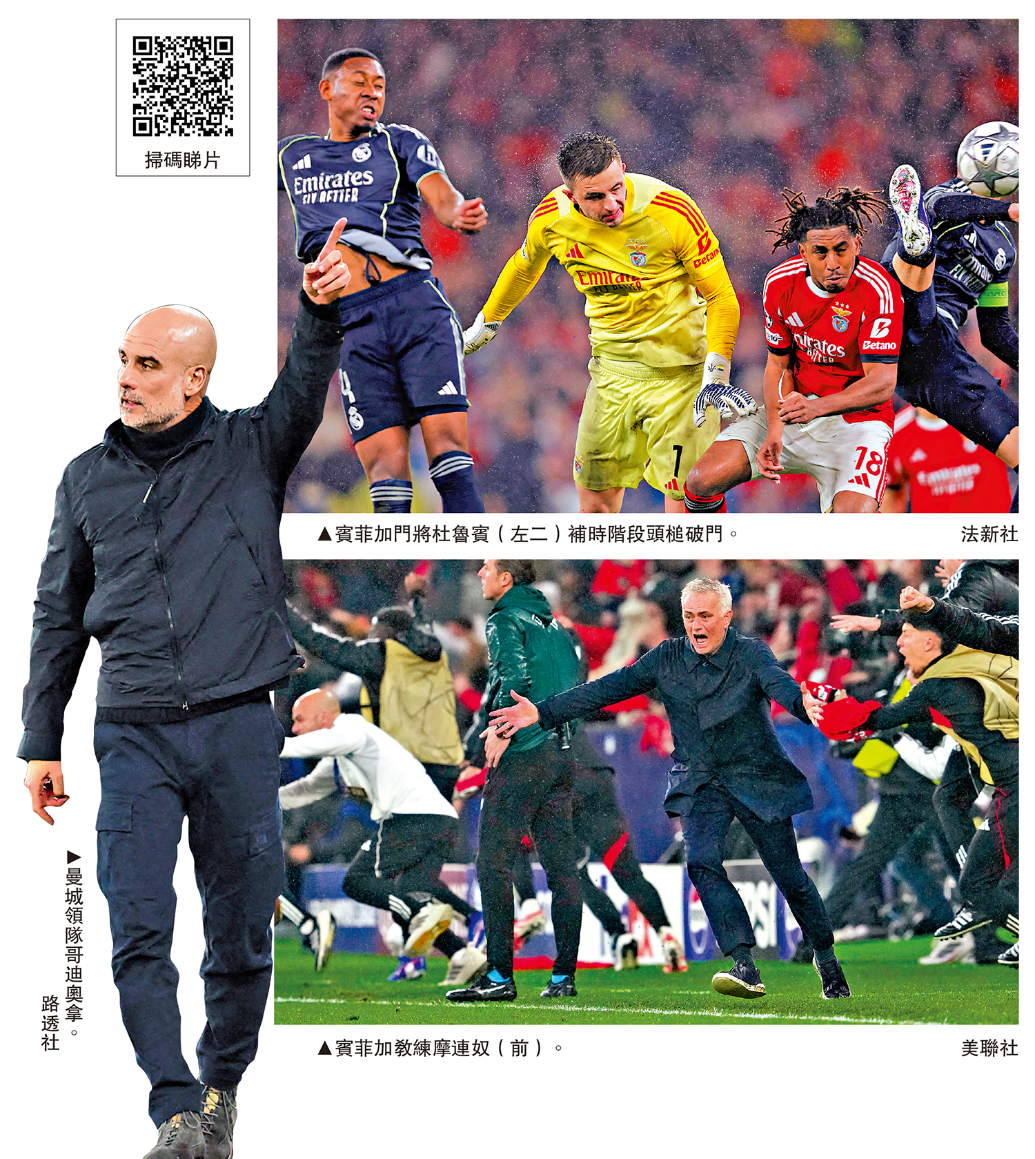 29日凌晨歐聯首階段最後一輪賽事,排名隨着戰情而變化萬千,最戲劇性一仗就是葡超賓菲加主場大戰皇家馬德里,門將杜魯賓補時8分鐘頂入令主隊以4:2擊退該支有2人被逐的15屆盟主後,最終憑1個球差反壓法甲馬賽獲得最後一個淘汰賽附加賽的席位,同時把皇馬踢出前8名而轉戰附加賽,取而代之就是曼城。曼城主帥哥迪奧拿賽後被問到會否感謝「球場宿敵」、賓菲加主帥摩連奴,前者帶笑回應:「當然會」。\大公報記者 譚德龍