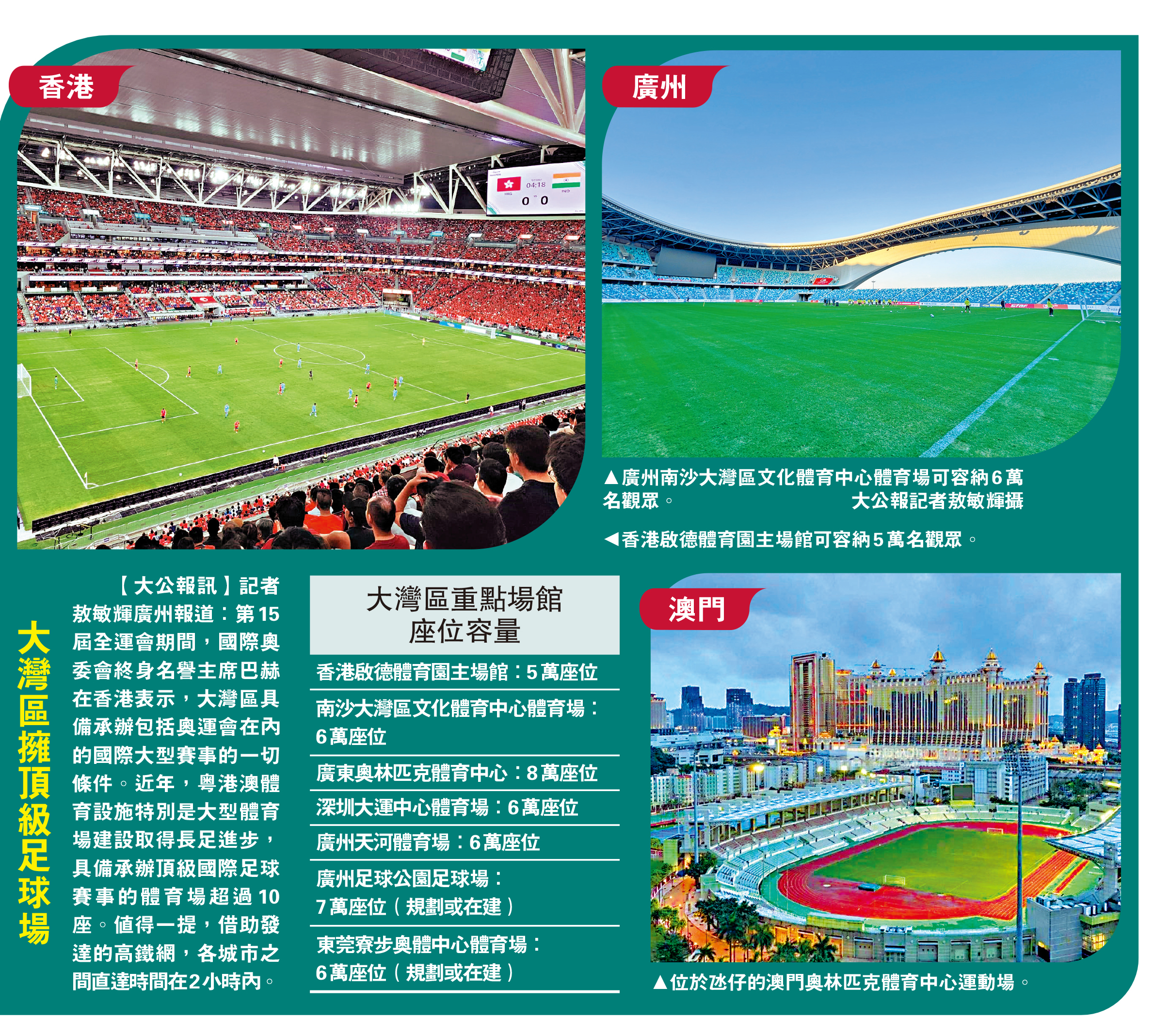 第15屆全運會後,進一步推動粵港澳三地協同辦賽、打造「體育灣區」提上議事日程。廣州市體育主管部門近日接受媒體訪問時表示,足球世界盃是全球最具影響力的足球盛事,粵港澳大灣區聯合申辦世界盃賽事對提升區域國際影響力、促進城市群協同發展具有重要意義,廣州將積極配合國家體育總局和中國足協的工作部署,協同港澳,積極開展相關申辦工作。\大公報記者 敖敏輝廣州報道