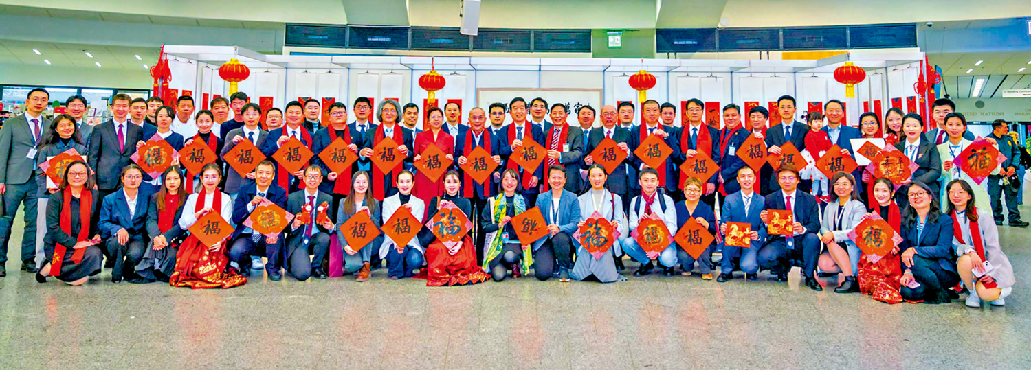 新春招待會是為了「躍馬迎春」,希望「福氣」走進千家萬戶。不同膚色的國際友人手裏拿着福卡,不同書體的「福」字在維也納聯合國總部圓大廳透出別具一格的魅力與美感。這些「福」字是由蘇士澍、鄭曉華、封開許、車樹林、潘衍習以及筆者在現場書寫的。