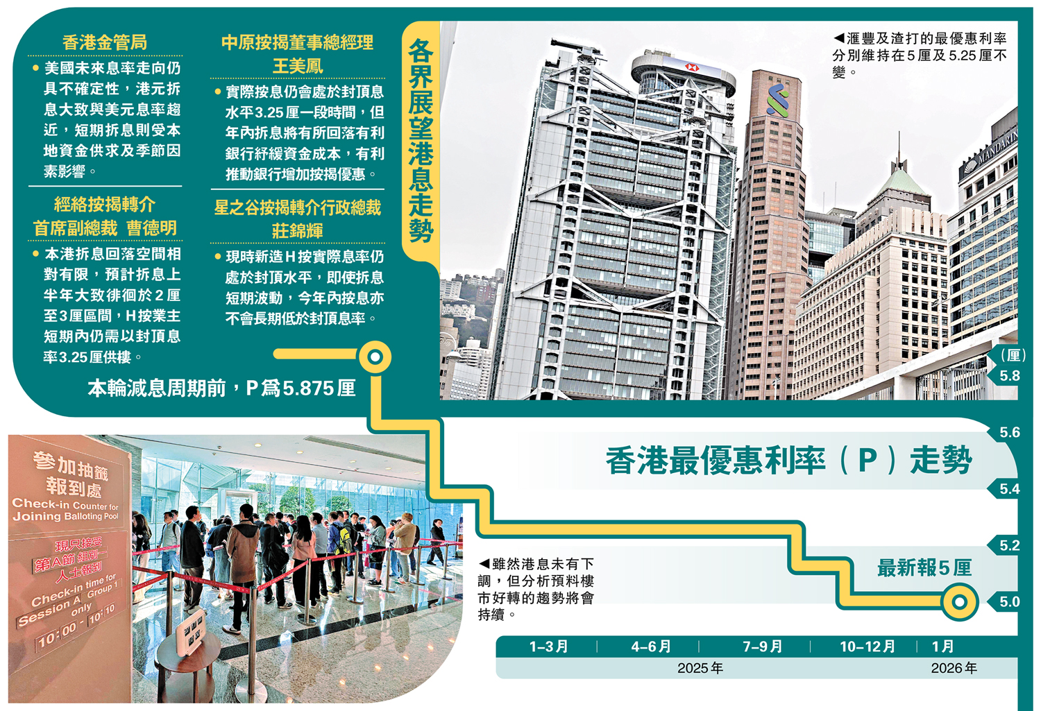 昨日1個月銀行同業拆息報2.65厘,曹德明認為,雖然美聯儲上半年仍有至少一次減息機會,但現時本港銀行體系總結餘仍維持約538億元,拆息回落空間相對有限,預計拆息上半年大致徘徊於2厘至3厘區間,H按業主短期內仍需以封頂息率3.25厘供樓。