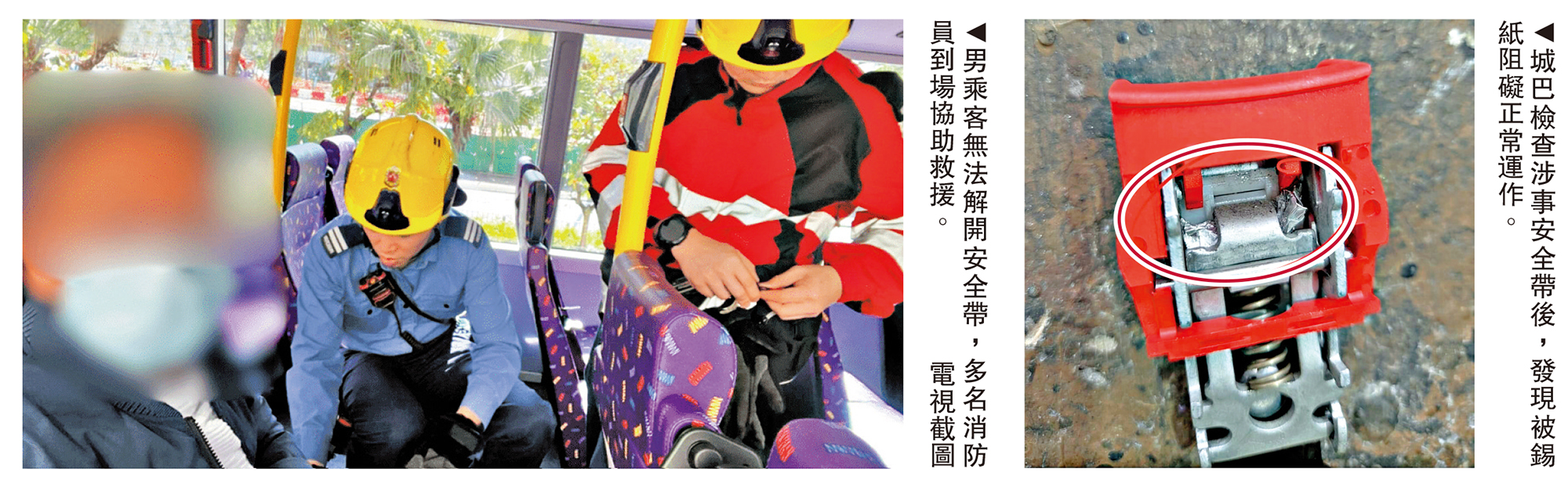 【大公報訊】記者肖泓宇報道:強制巴士乘客佩戴安全帶的新法例日前生效,若巴士座位已裝設安全帶,乘客必須全程佩戴。昨日上午,一名城巴男乘客欲下車時未能解開安全帶,要消防員介入協助。城巴表示,涉事安全帶鎖扣內部被一張錫紙阻礙正常運作,正循有人蓄意破壞安全帶方向調查,將報警處理。運輸署表示,非常關注事件,已要求營辦商就個案提交報告,嚴肅跟進。