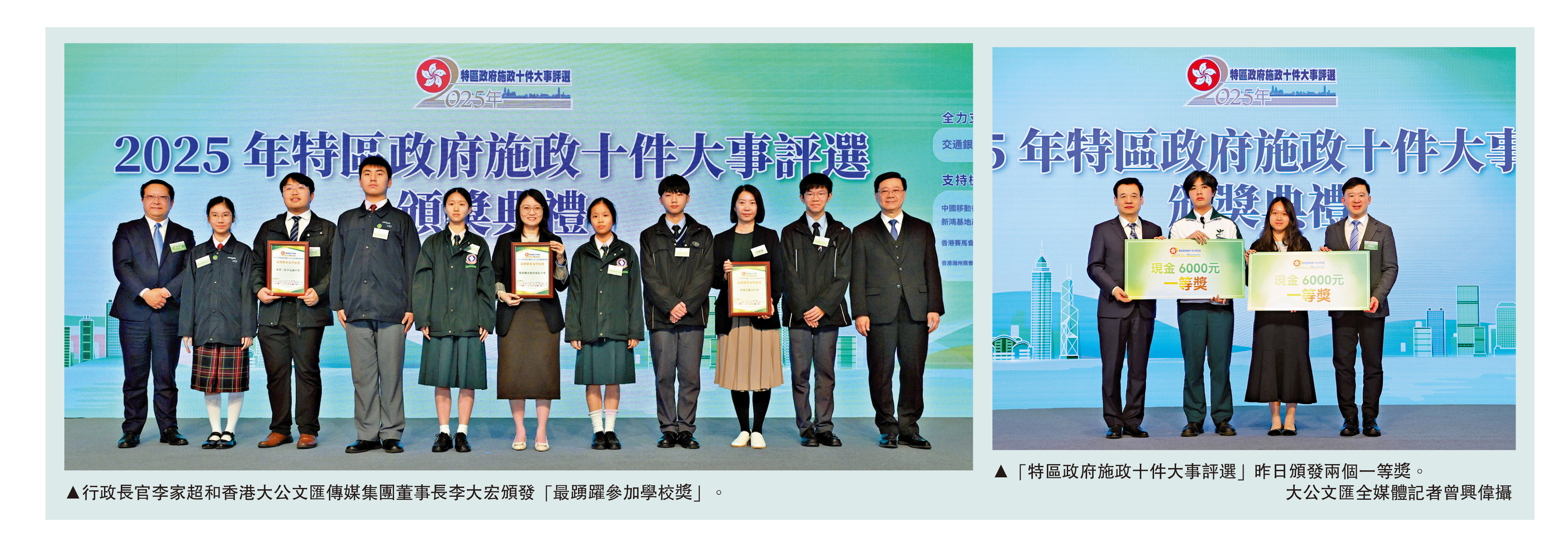 由香港文匯報發起、大公報、點新聞等30家媒體聯合主辦,54間團體協辦的「2025年特區政府施政十件大事評選」昨日舉行頒獎典禮。「立法會選舉成功舉行 優質民主開創新局」在是次評選中獲得最多市民關注,其次為「宏福苑發生五級大火 齊心協力救災善後」。