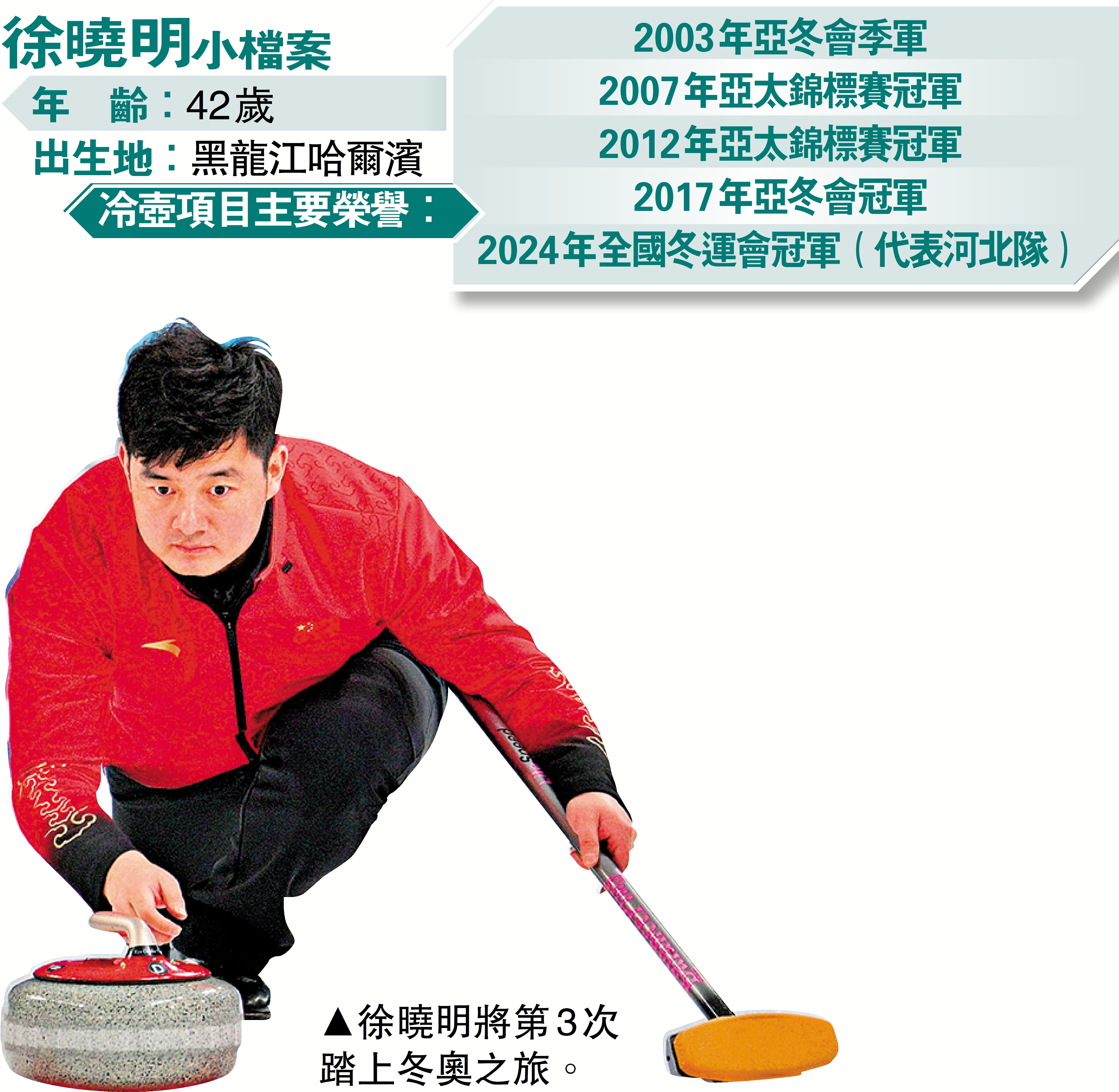 米蘭冬奧會上,42歲的冰壺選手徐曉明將第三次踏上奧運之旅,而上一次參加奧運還是12年前的索契冬奧。那屆冬奧是中國男隊距離奧運獎牌最近的一次,首次殺入四強賽,惜不敵實力強勁的加拿大隊,而銅牌賽亦憾負於瑞典隊。