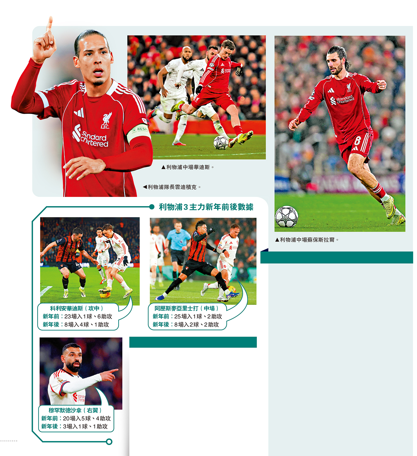 利物浦隊中3名主力:新加盟的進攻中場科利安華迪斯、中場阿歷斯麥亞里士打和右翼「埃及王」穆罕默德沙拿,上半季表現欠佳備受外間批評。踏入新一年後情況似有改善,例如華迪斯開始取得入球,麥亞里士打的比賽狀態由季初的谷底回升,沙拿的積極性也明顯提高,他們在剛過去的歐聯亦齊齊有「士哥」;若3人是「真翻身」,固然利好球隊爭取歐聯錦標,但若只是「假反彈」,就恐怕連保住來季歐聯資格亦有困難。\大公報記者 譚德龍