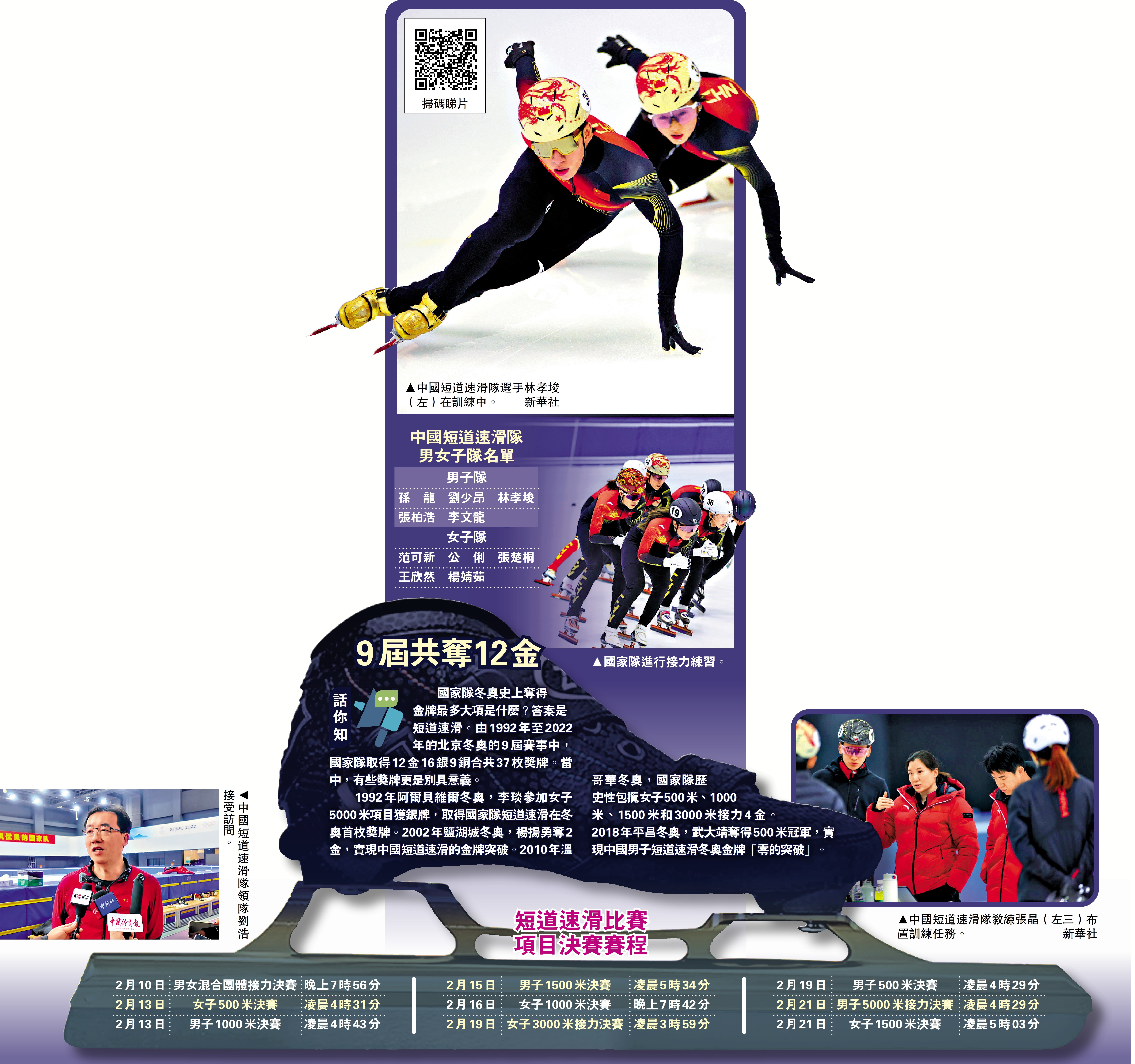 米蘭冬奧會短道速滑比賽將於2月10日至20日舉行,將產生9枚金牌,分別為男、女500米、1000米、1500米和男子5000米接力、女子3000米接力、混合團體接力。