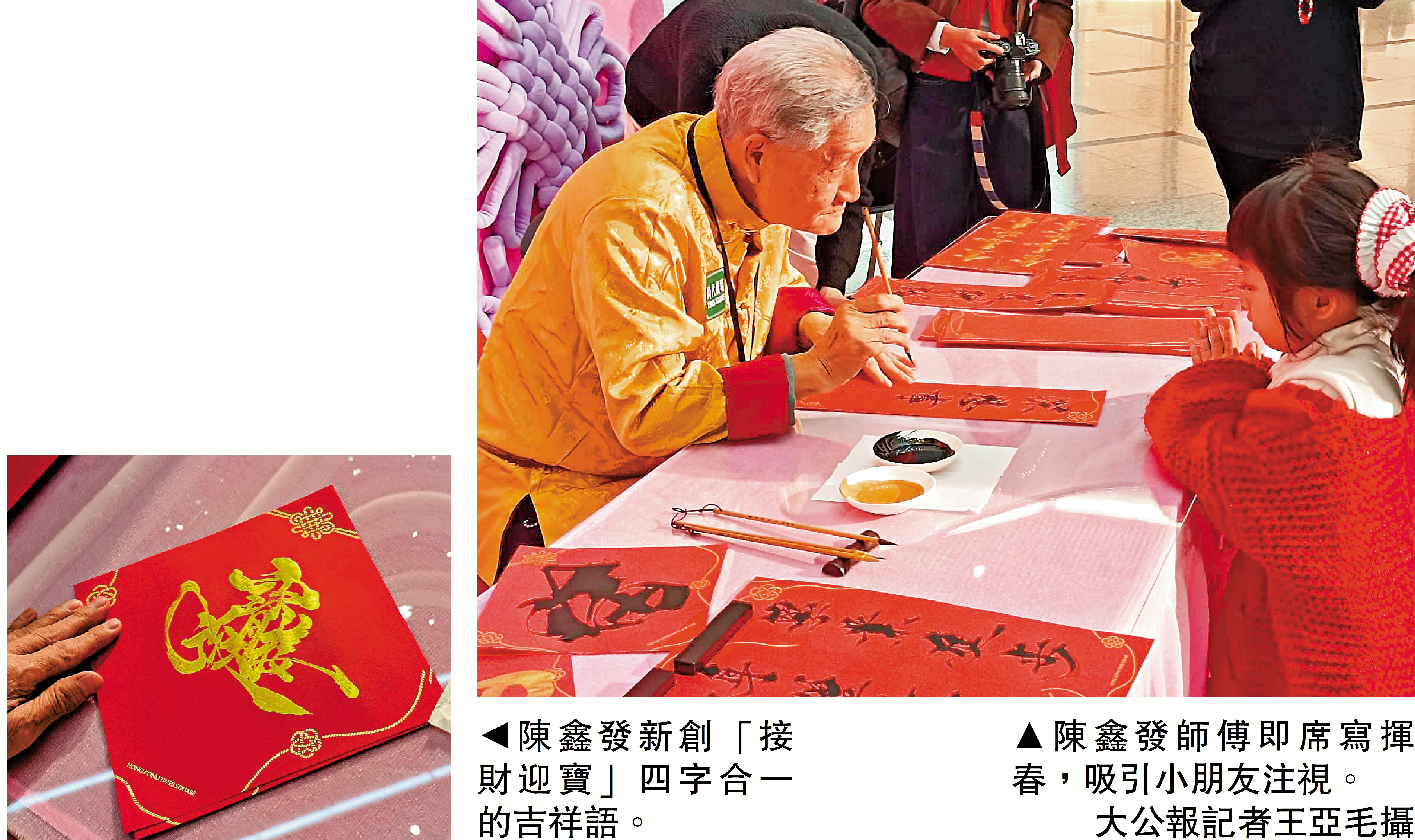 歲晚將至,相較於印刷揮春,更有溫度的手寫揮春越來越受港人追捧。今年85歲的書法匠人陳鑫發堅持手寫揮春數十年,曾在旺角、銅鑼灣、灣仔街頭擺檔,近幾年轉入北角新光戲院旁的臨時街舖,為港人帶來充滿力量和祝福的一張張揮春,包括今年新創「接財迎寶」四字合一的吉祥語,「只要下筆就全神貫注,環境沒什麼影響,只要客人開心,我就會繼續寫下去。」\ 大公報記者 王亞毛