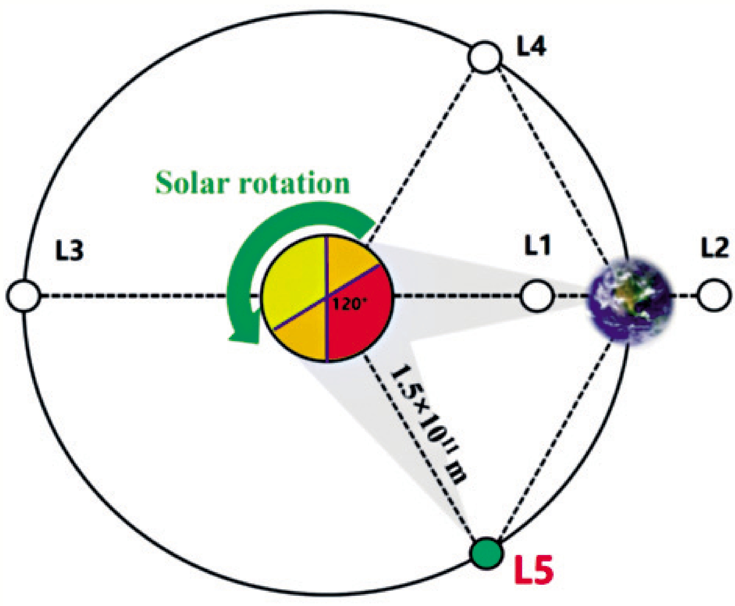 「羲和號」環繞地球運行,「羲和二號」則不是。「羲和號」科學與應用系統總設計師、南京大學天文與空間科學學院教授李川介紹,太陽和地球有5處引力平衡點,L1、L2、L3在日地連線上,L4、L5則在地球環繞太陽運行的軌道上,各自與太陽、地球構成邊長約1.5億公里的等邊三角形,如果將地球公轉方向視作「前方」,L5在地球的「身後」。