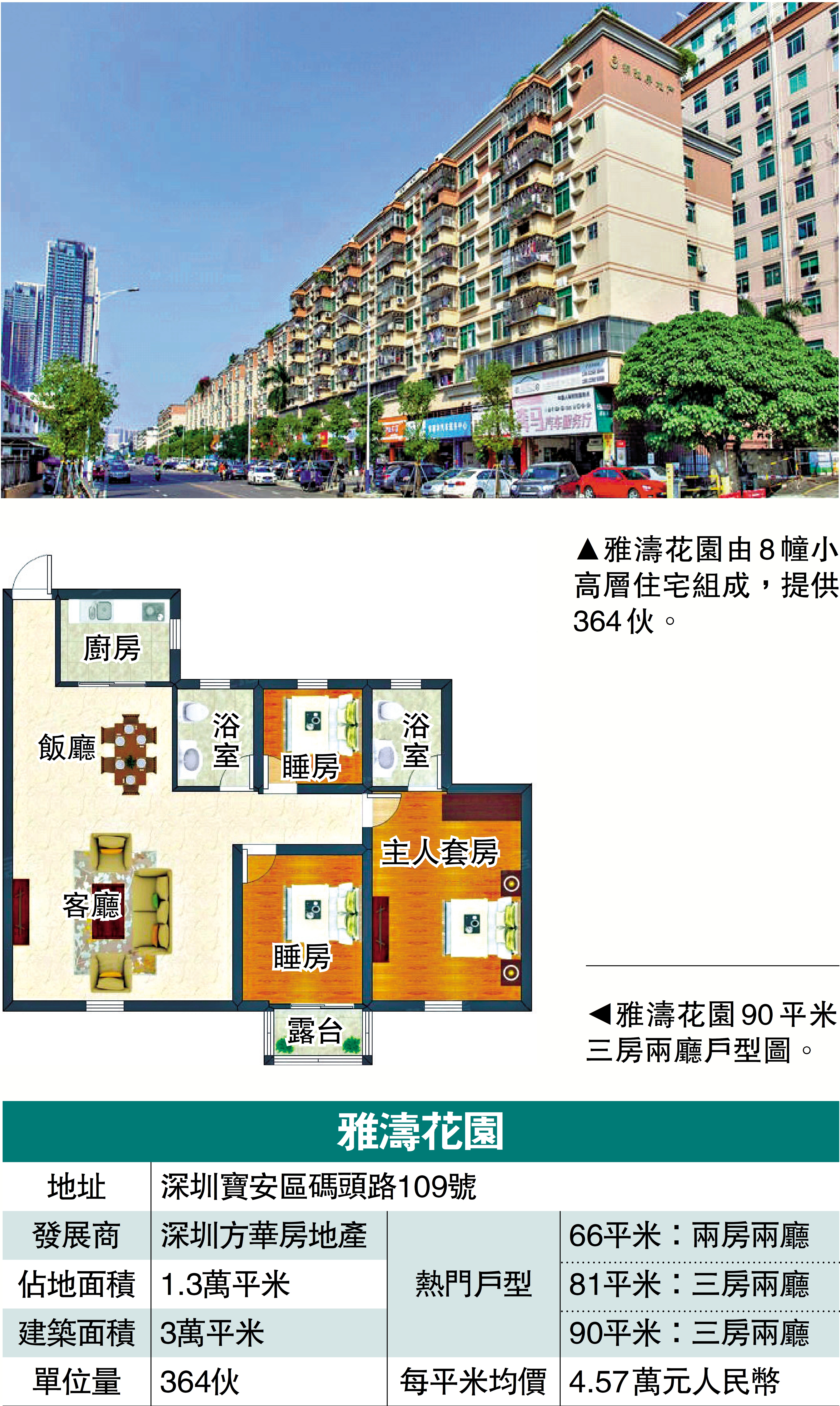 雅濤花園位於寶安區碼頭路109號,於2001年建成,樓齡25年,項目距離地鐵1號線坪洲站約3至5分鐘步程,周邊公交網絡密集,可快速接駁寶安大道、西鄉大道等主幹道。據房天下數據顯示,屋苑每平米成交價約4.57萬元(人民幣,下同),與去年同期比較仍保持穩定,展現抗跌屬性。