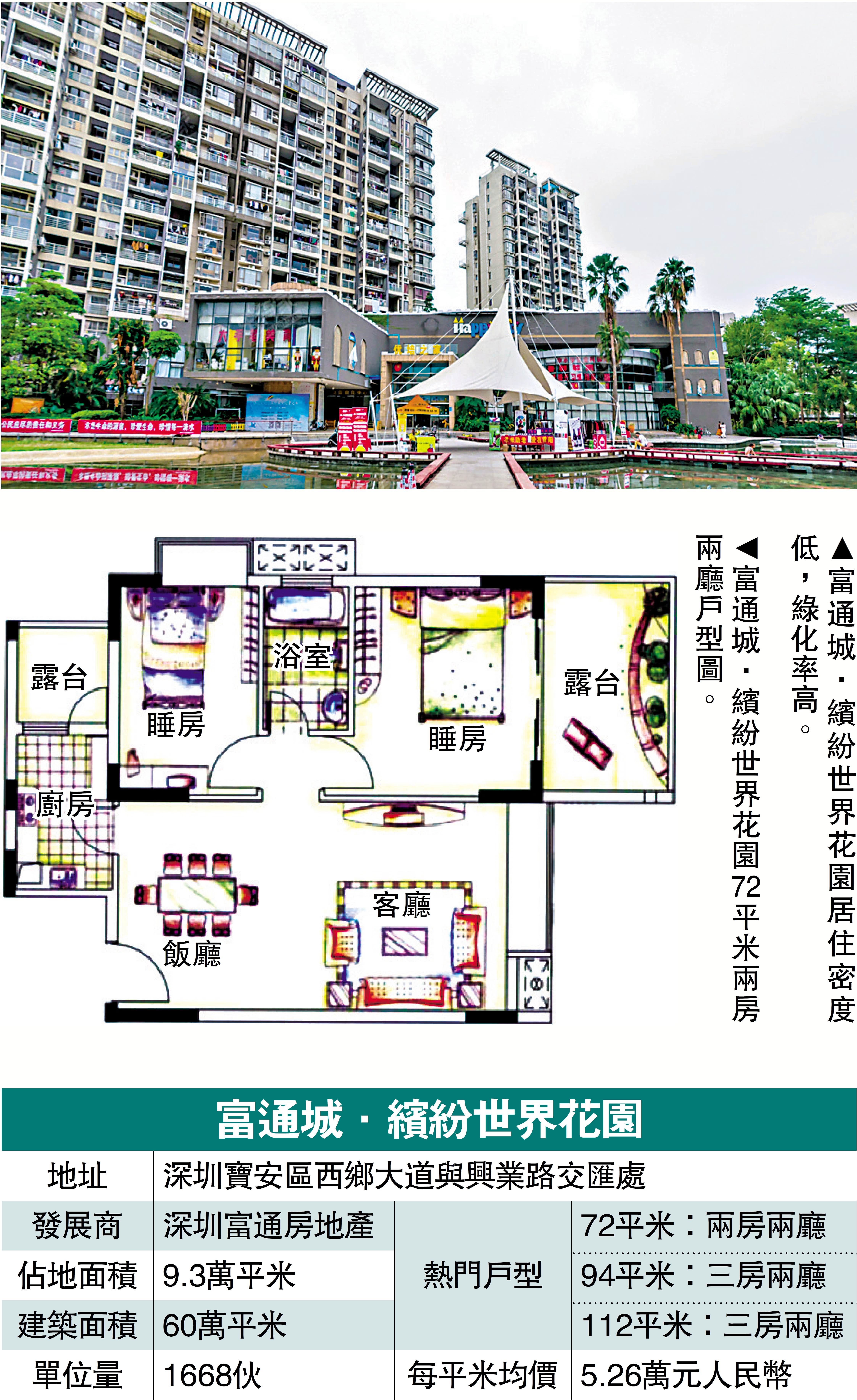 繽紛世界花園為富通城第一期,提供1668伙,主力戶型為72至112平米兩房至三房,佔比超70%。二手掛牌每平米均價約5.26萬元(人民幣,下同),如70平米兩房戶總價305萬元,每平米均價4.57萬元;93平米三房戶總價約555萬元,每平米均價5.92萬元,首付15%,月供約1.3萬元。