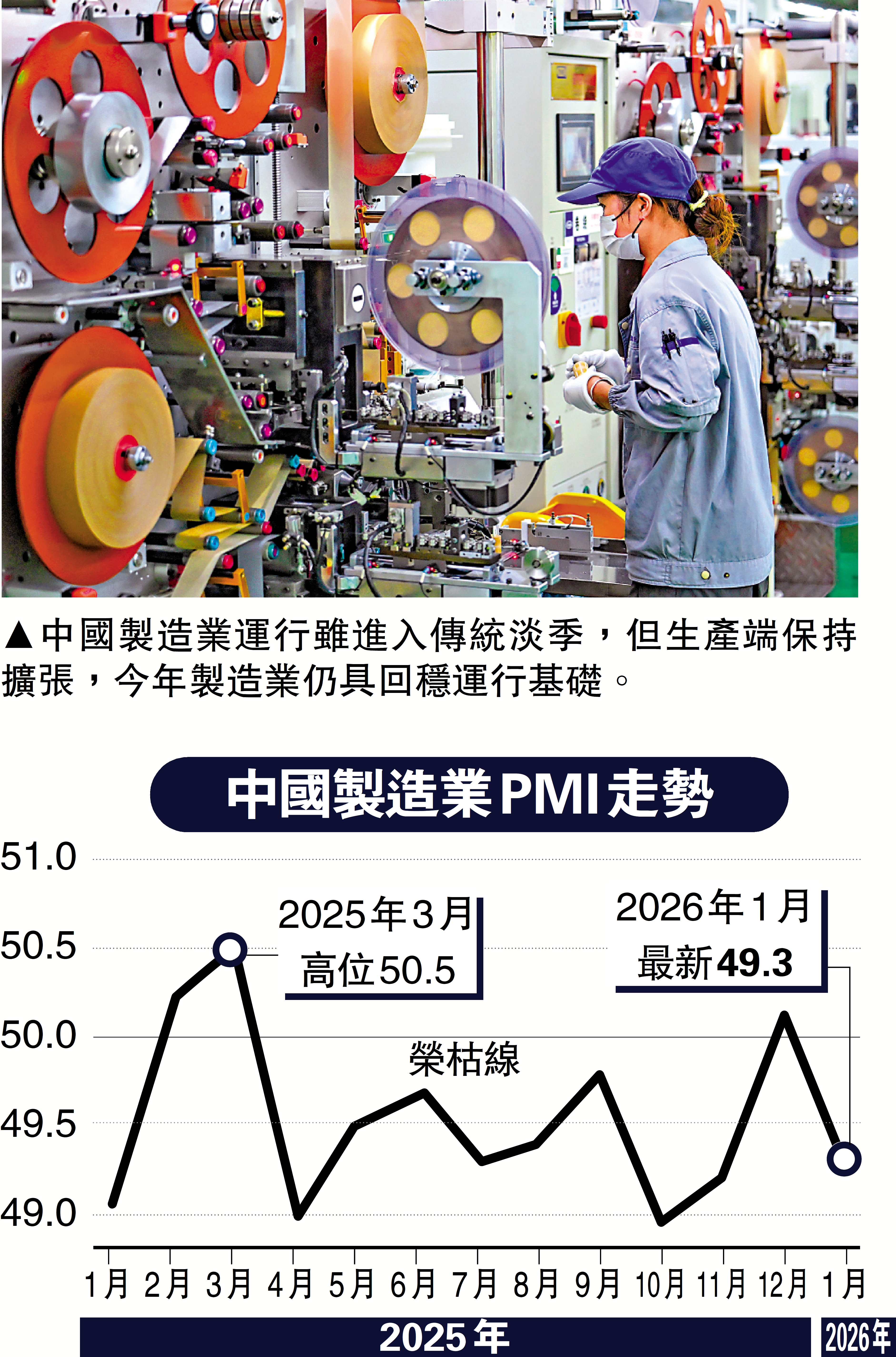 【大公報訊】記者倪巍晨上海報道:季節性淡季疊加市場需求略顯不足,拖累官方採購經理指數(PMI)跌破榮枯線。國家統計局數據顯示,1月中國製造業和非製造業PMI分別報49.3、49.4,均較前值下降0.8個百分點。國家統計局服務業調查中心首席統計師霍麗慧表示,1月經濟景氣度有所回落,製造業雖進入淡季,但企業生產仍續擴張,高技術製造業持續領跑,企業預期保持樂觀。分析指出,製造業運行雖然進入傳統淡季,但生產端保持擴張、工業原料和產成品價格聯動上漲、產業結構也不斷優化,疊加後續宏觀政策的進一步發力,今年製造業仍具回穩運行基礎。