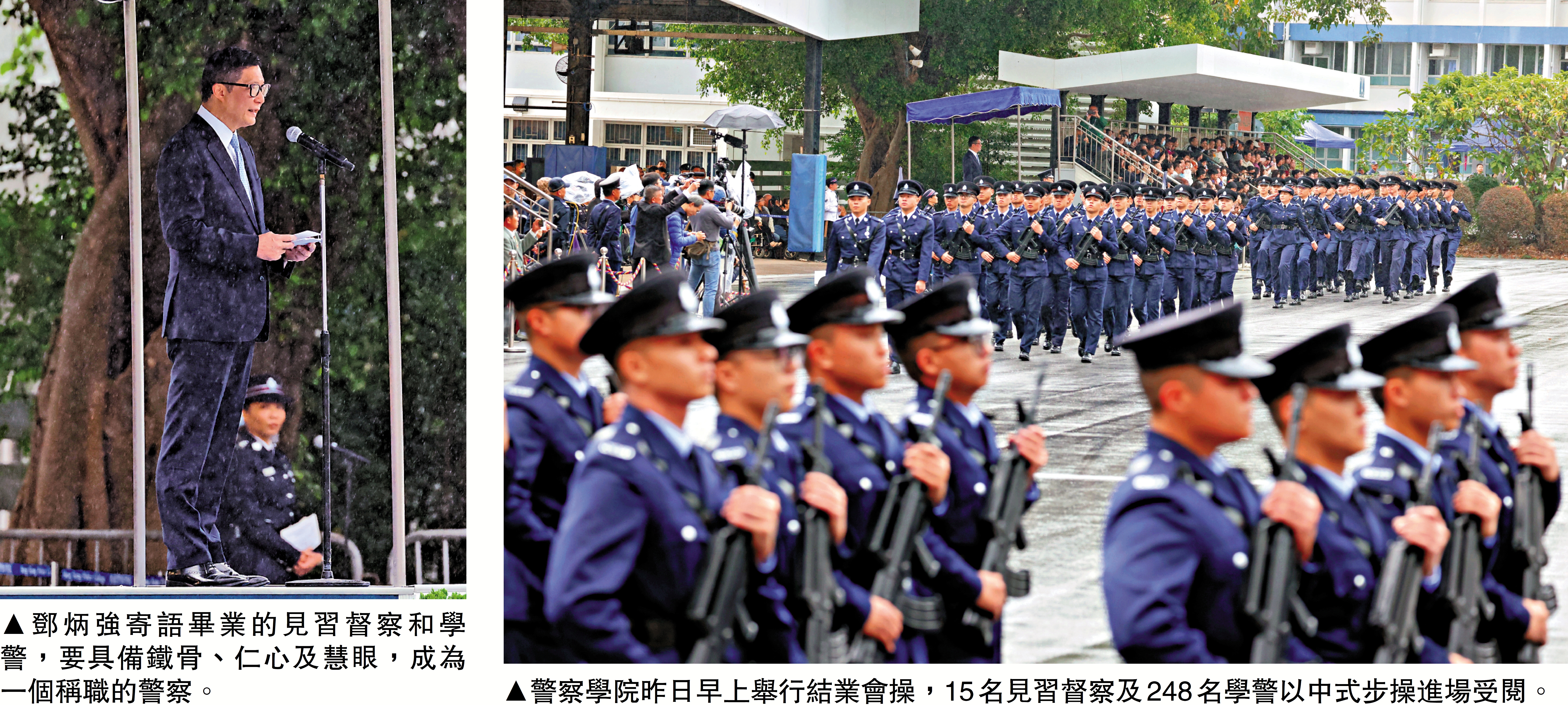 【大公報訊】記者陳杰報道:香港警察學院昨日(31日)舉行結業會操,保安局局長、前警務處處長鄧炳強擔任檢閱官,15名督察及248名警員正式畢業。鄧炳強局長於典禮上勉勵畢業學員,強調警務人員須具備「鐵骨」、「仁心」及「慧眼」三大特質,方能勝任維護香港治安的重要使命。