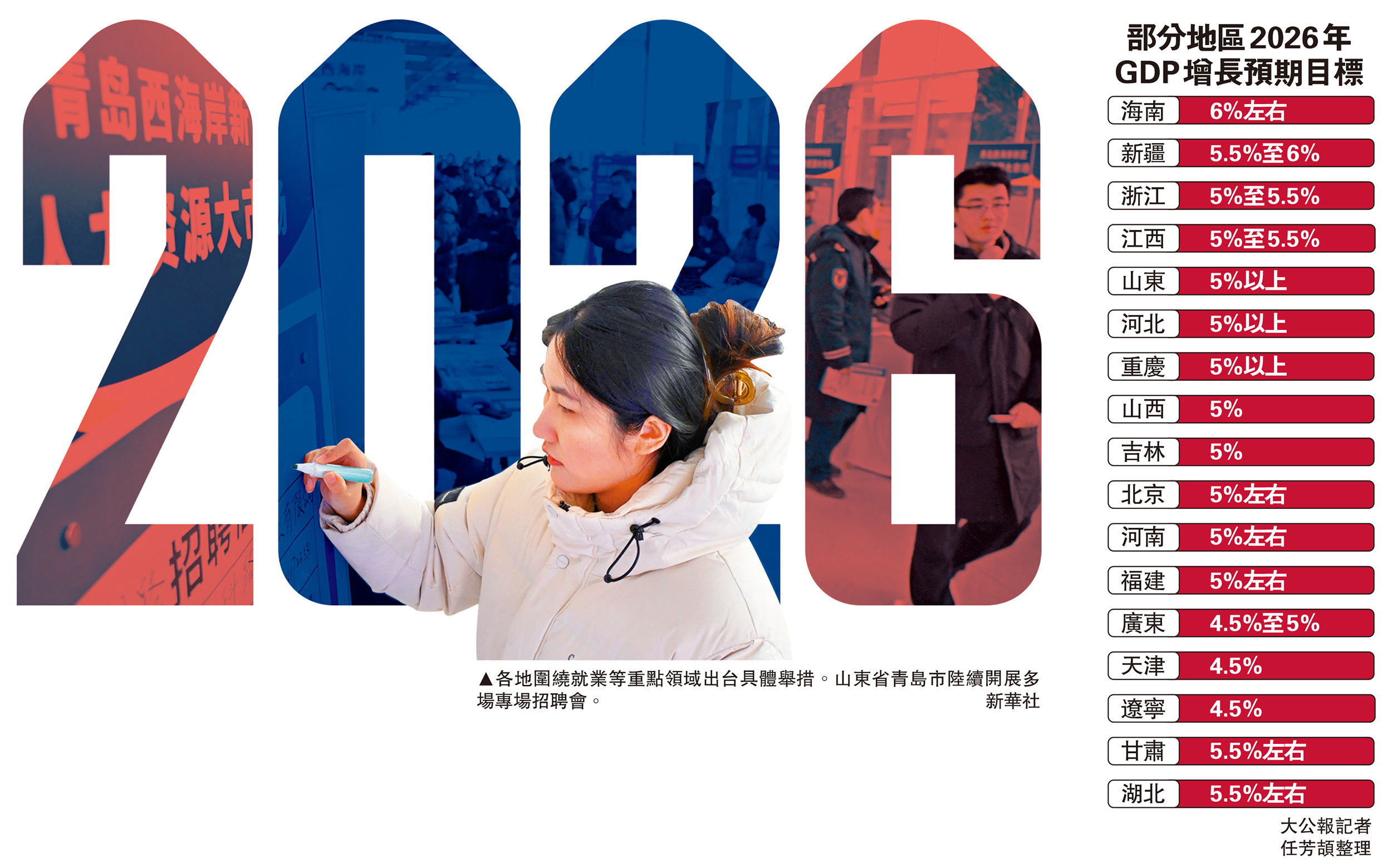 各省份GDP增長目標普遍聚焦5%左右區間,既兼顧發展韌性,也為應對不確定性預留空間,展現出「穩中求進、以進促穩」的戰略定力。立足新起點,各地緊扣新質生產力培育、民生福祉提升、消費潛力釋放等核心方向,為2026年經濟開局注入強勁新動能,奮力實現「十五五」開好局、起好步。\大公報記者 任芳頡北京報道