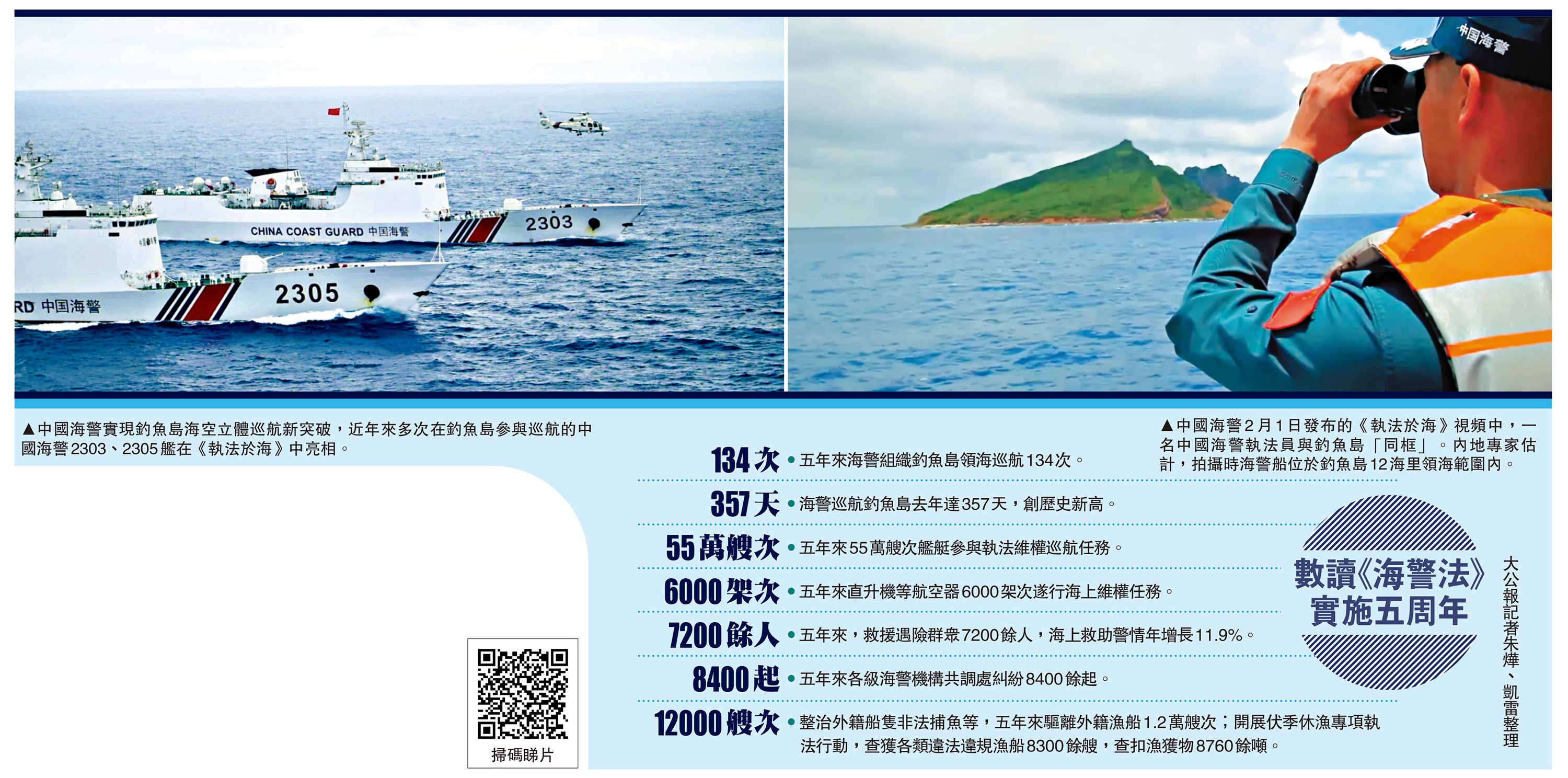 視頻中,一名中國海警執法員與釣魚島「同框」,中國海警執法員手臂上鮮艷的國旗臂章與釣魚島的海天美景相映成輝。據悉,這是中國海警首次披露釣魚島巡航執法的畫面。五年來,中國海警累計動用艦艇55萬艘次、航空器6000架次遂行海上維權任務,組織釣魚島領海巡航134次。\大公報記者 朱燁、凱雷