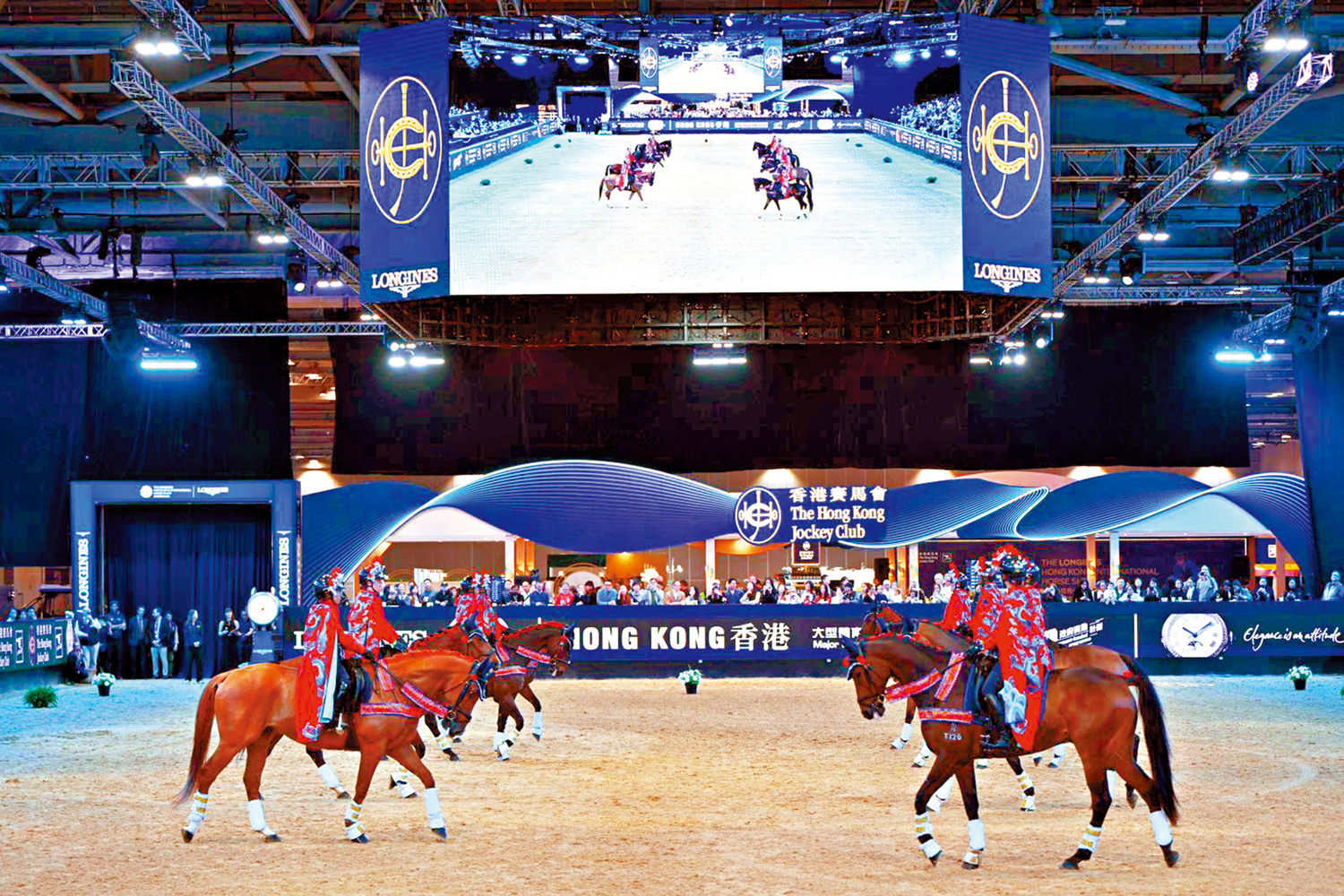 【大公報訊】據中新社報道:8名騎師身着馬術裝備、佩戴「七星額子」盔和紅色披風穩坐鞍上,伴隨着二胡的旋律,精準引導馬匹同步完成前進、後退、旋轉等一系列動作……在這場時長約6分鐘的音樂騎術表演中,人馬之間的配合毫無滯澀。第2屆浪琴香港國際馬術盛典1月30日至2月1日在香港亞洲國際博覽館舉行,上述音樂騎術表演由香港賽馬會策劃並於1月30日亮相,收穫來自世界各地觀眾的掌聲。