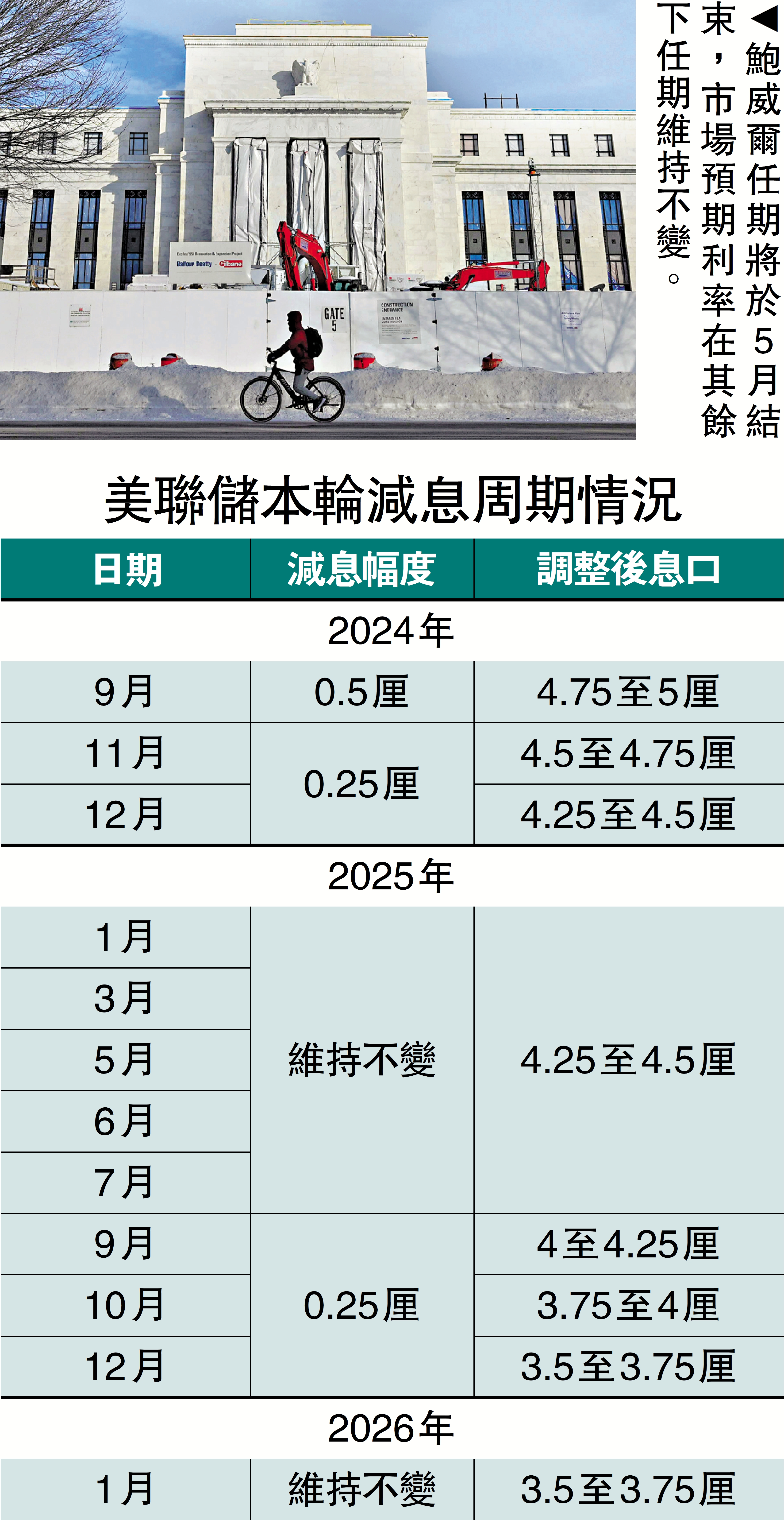 美聯儲自2024年9月至今累計減息1.75厘。華贏東方證券研究部董事李慧芬預計,美聯儲將於今年中期重啟減息步伐,料下半年將減息兩次,合計0.5厘,隨後2027年再減一次。